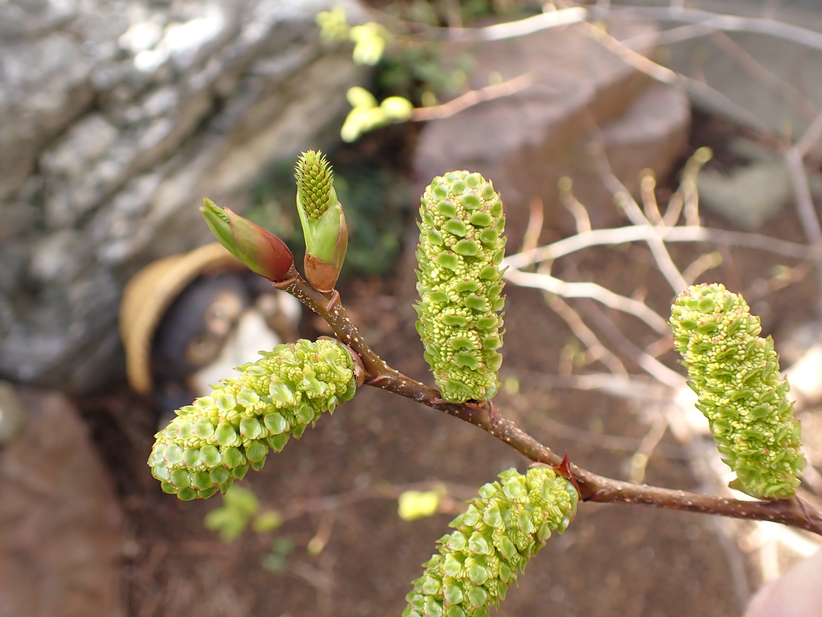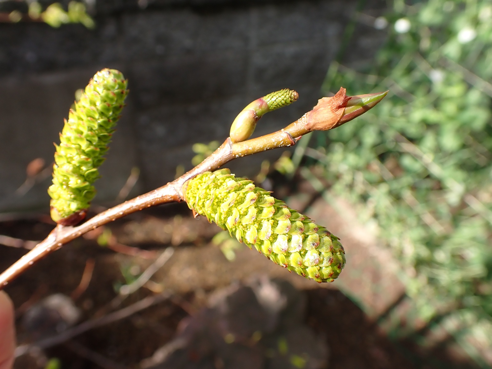 2026/03/07 ヤシャブシ 2026/03/07庭、植物ヤシャブシasahama 開花始まる 前回の記事から3日.雌花穂も姿を現し、あと少しで開花が始まる花が殆どの中・・・ 一部の雄花穂は葯が開いて開花が始まった模様.