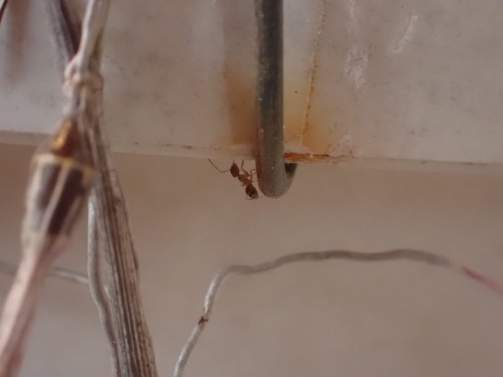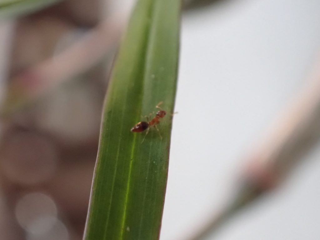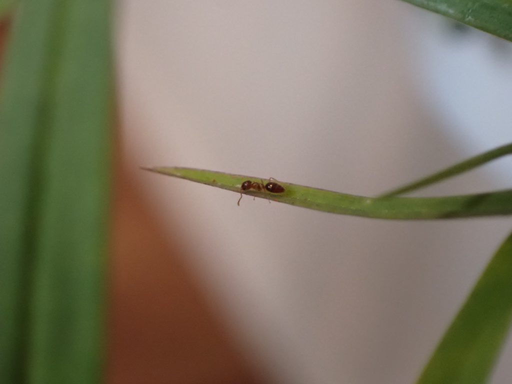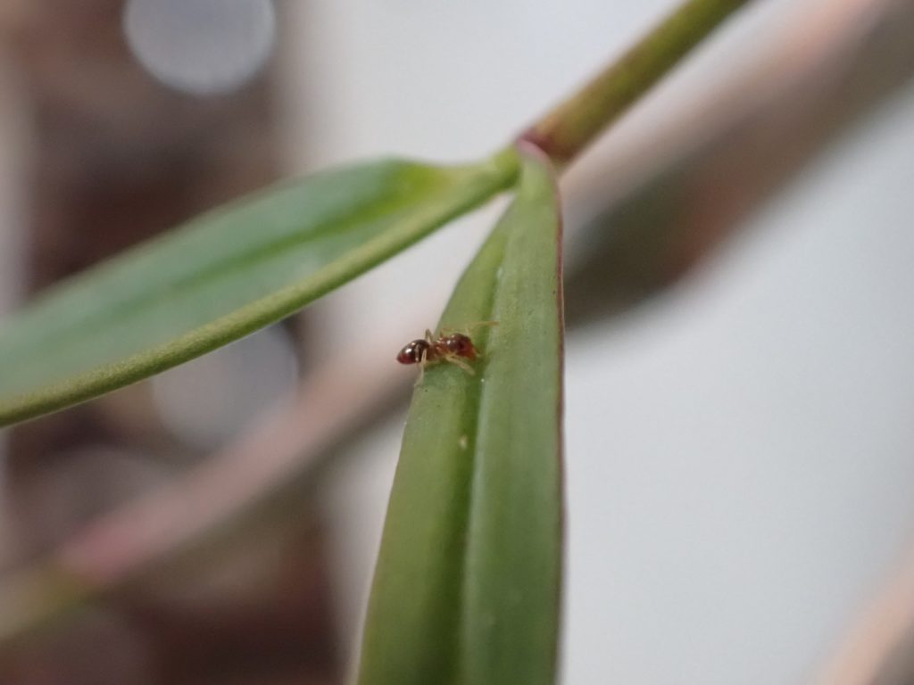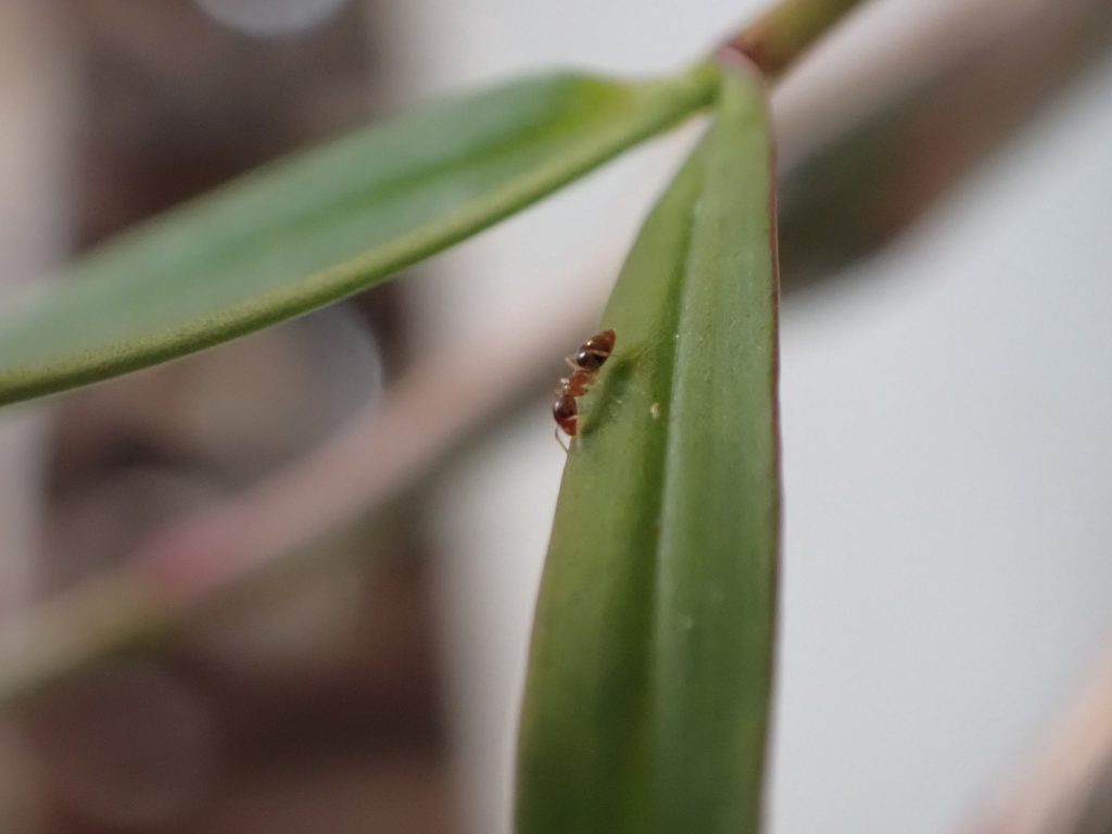 光が十分でなく、鮮明な写真がなかなか撮れないのがもどかしいけど、Dendrobiun falconeri の葉をうろつく小さなアリを撮影できた.この腹部が尖った濃いあめ色のアリは同株の植え込み材に住み着いているようで、時々株や鉢を歩いているのを目にする.葉をうろつく様子を見ると、葉の裏表、かつ根元から先端までくまなく歩き、時々小さな何かを咥えようとする仕草が見受けられる{(3)がそれっぽい}.同株の葉にはハダニが付いており、いつ葉がダメになるのか戦々恐々している所だが、もしこのアリがハダニの卵などを食べているのなら嬉しい所だ.ちなみにこのアリは、ハダニの親に対しては無関心らしく素通りする.