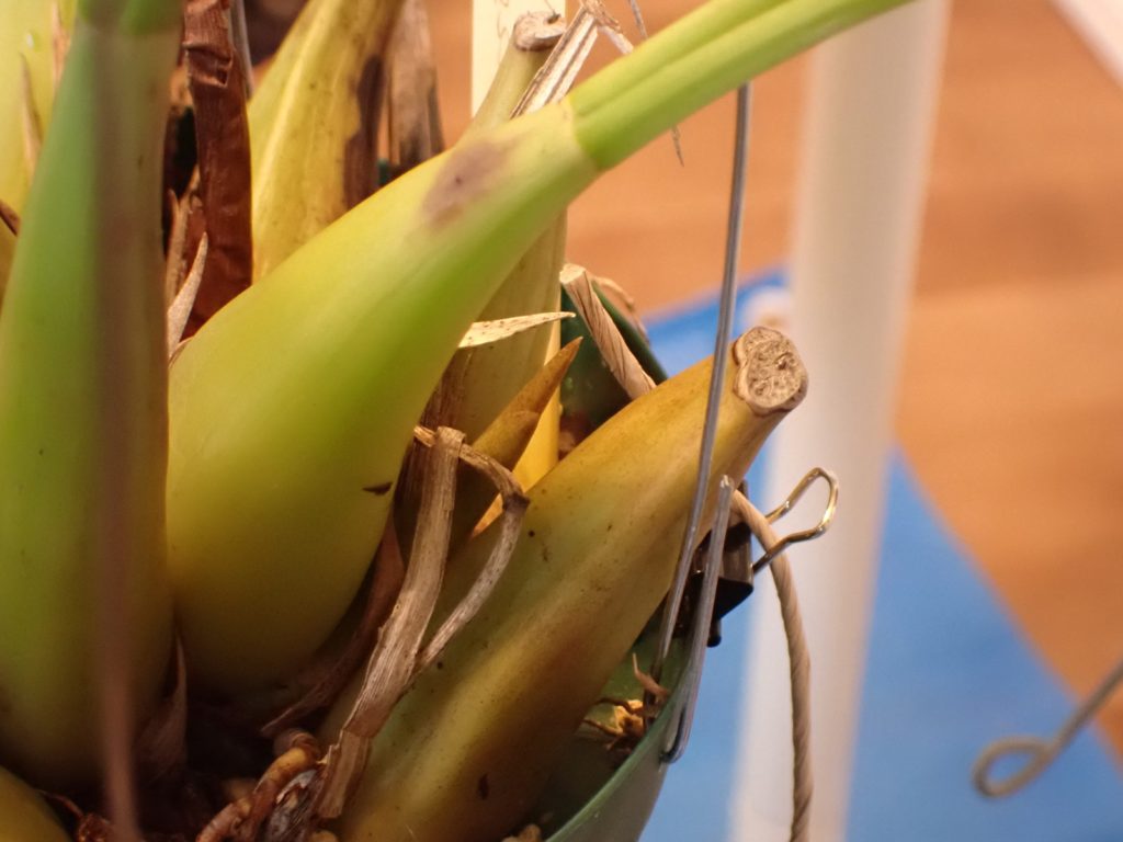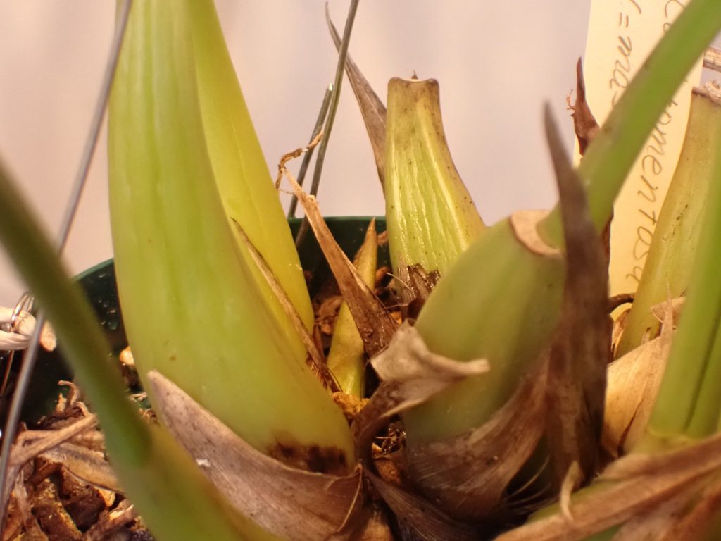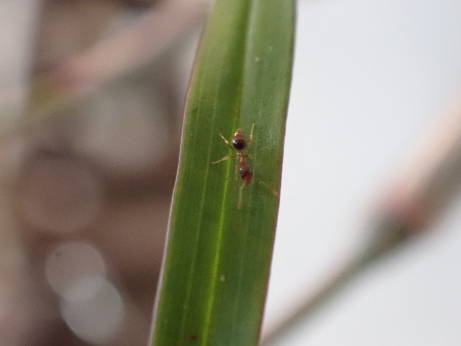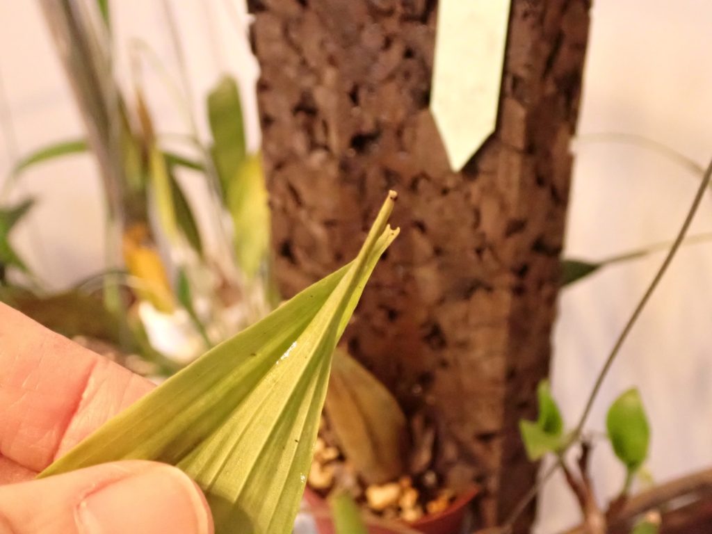 光が十分でなく、鮮明な写真がなかなか撮れないのがもどかしいけど、Dendrobiun falconeri の葉をうろつく小さなアリを撮影できた.この腹部が尖った濃いあめ色のアリは同株の植え込み材に住み着いているようで、時々株や鉢を歩いているのを目にする.葉をうろつく様子を見ると、葉の裏表、かつ根元から先端までくまなく歩き、時々小さな何かを咥えようとする仕草が見受けられる{(3)がそれっぽい}.同株の葉にはハダニが付いており、いつ葉がダメになるのか戦々恐々している所だが、もしこのアリがハダニの卵などを食べているのなら嬉しい所だ.ちなみにこのアリは、ハダニの親に対しては無関心らしく素通りする.