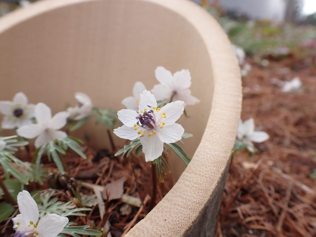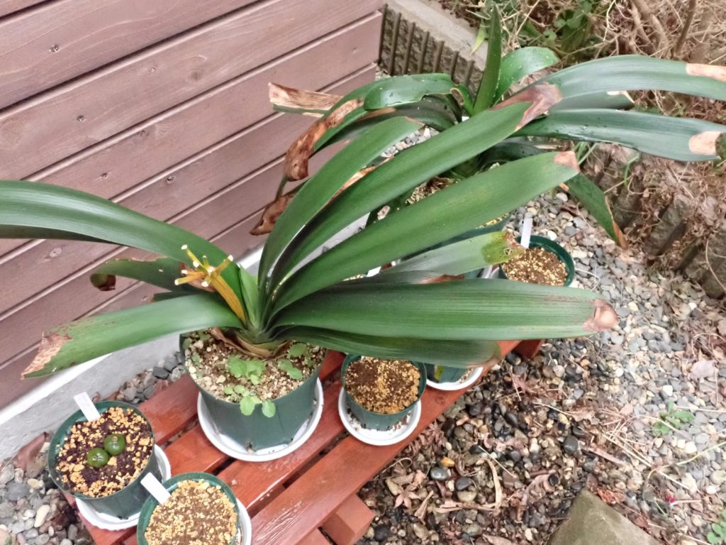 用土を満たしたら水をたっぷり与え、ラベルを挿して屋外フラワーベンチに置いての管理に移した.