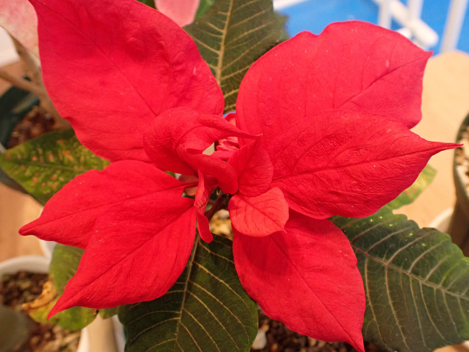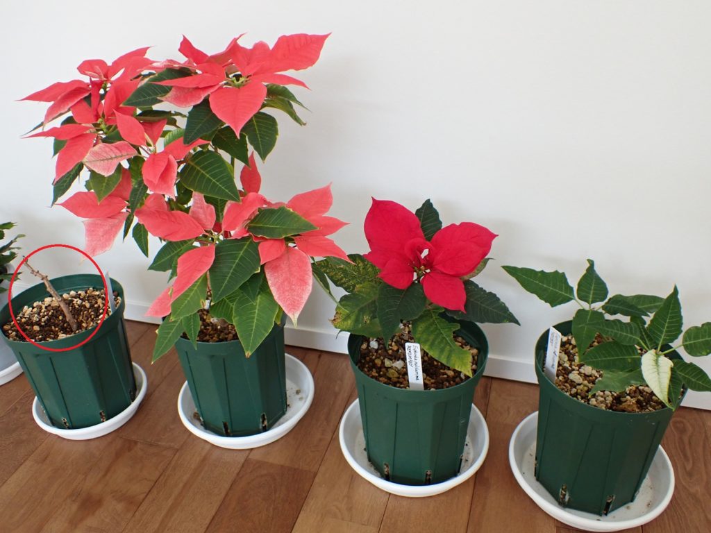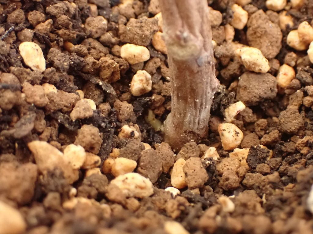 2026/03/07 ポインセチア 2026/03/07植物ポインセチアasahama 沖縄由来の株は・・・? 葉が無くなり、枝にも皺が寄って見るからに危なげな沖縄由来の株(画像左端)について、辛抱たまらず根本を少し掘ってみると・・・ 驚いたことに、地下部から新たな芽が伸び出しているのを発見.このまま様子を見る事にする.