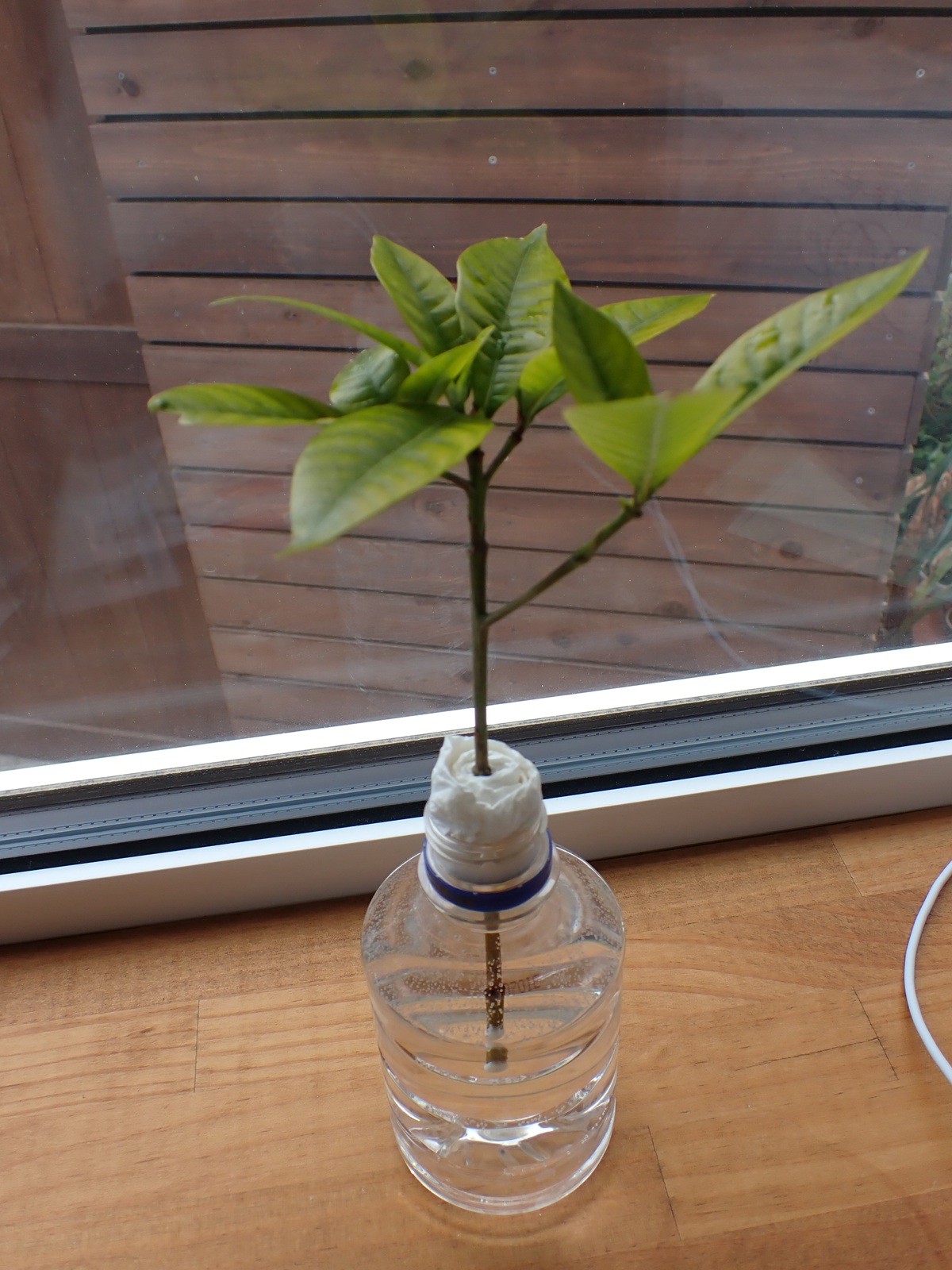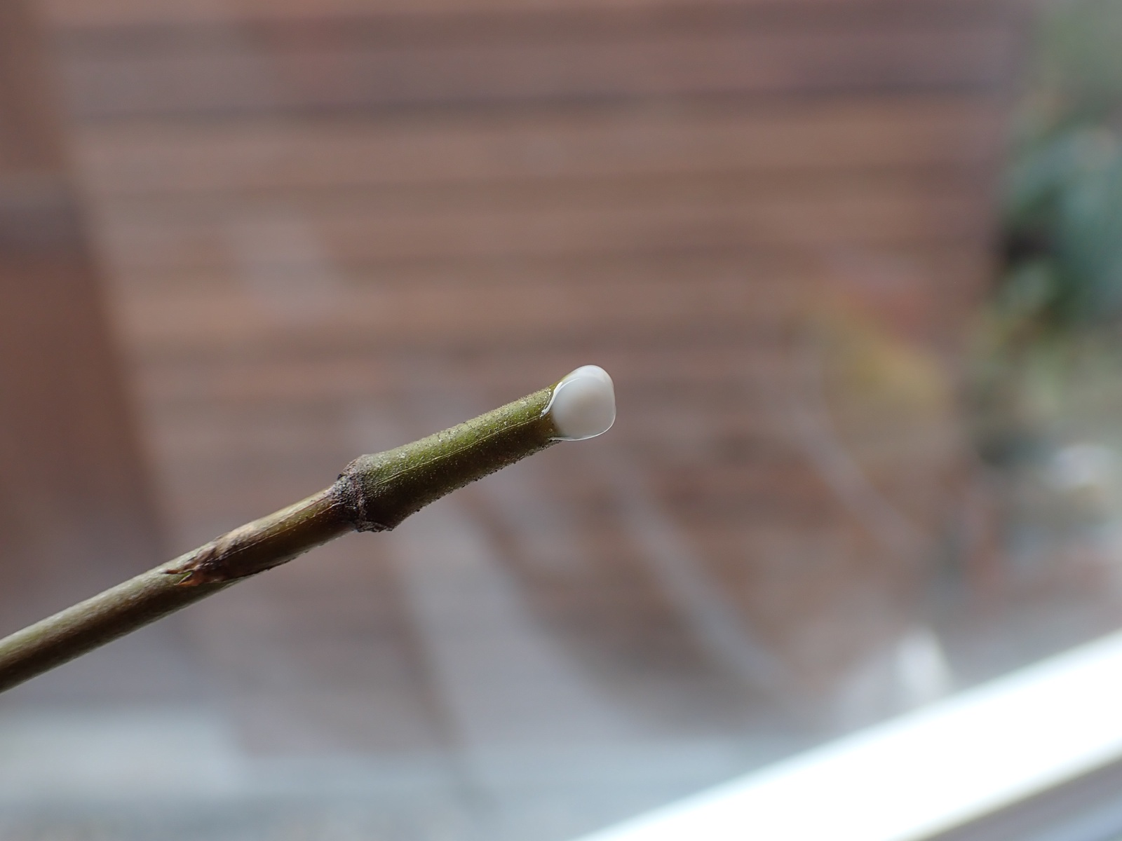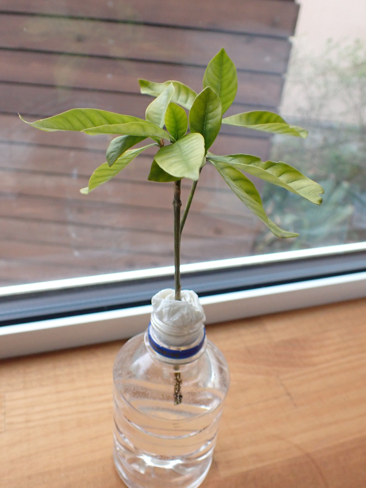 2026/04/05 実験#2 2026/04/05植物クチナシasahama 今度はクチナシの枝で 昨日朝から水に浸しているボンドは今朝になっても逸散していないので・・・ 今度はクチナシの枝で試してみる. 切り口から水分が供給されるからか、数時間経ってもボンドは殆ど透明にはならなかったが、 とりあえず水挿しにしてみる.まずは、この状態で水を吸い上げられるかどうかを見る.