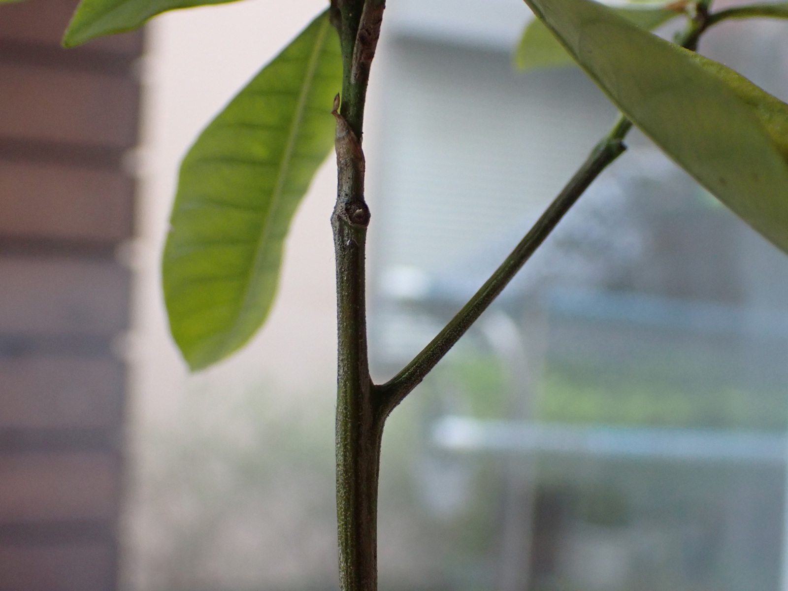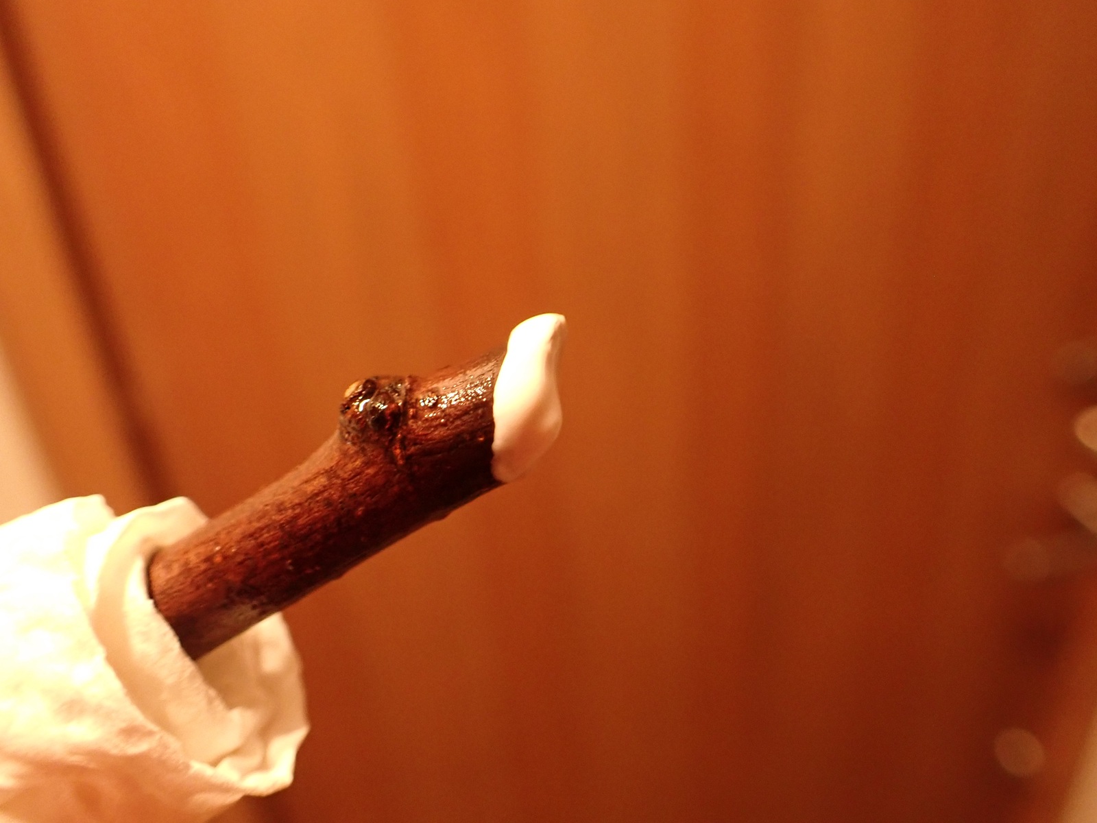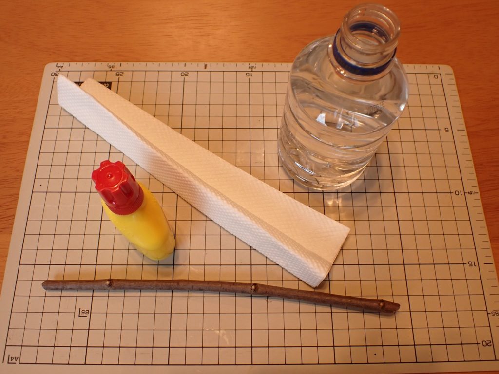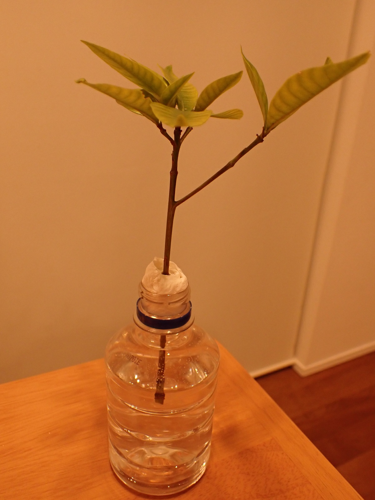 2026/04/05 実験#2 2026/04/05植物クチナシasahama 今度はクチナシの枝で 昨日朝から水に浸しているボンドは今朝になっても逸散していないので・・・ 今度はクチナシの枝で試してみる. 切り口から水分が供給されるからか、数時間経ってもボンドは殆ど透明にはならなかったが、 とりあえず水挿しにしてみる.まずは、この状態で水を吸い上げられるかどうかを見る.