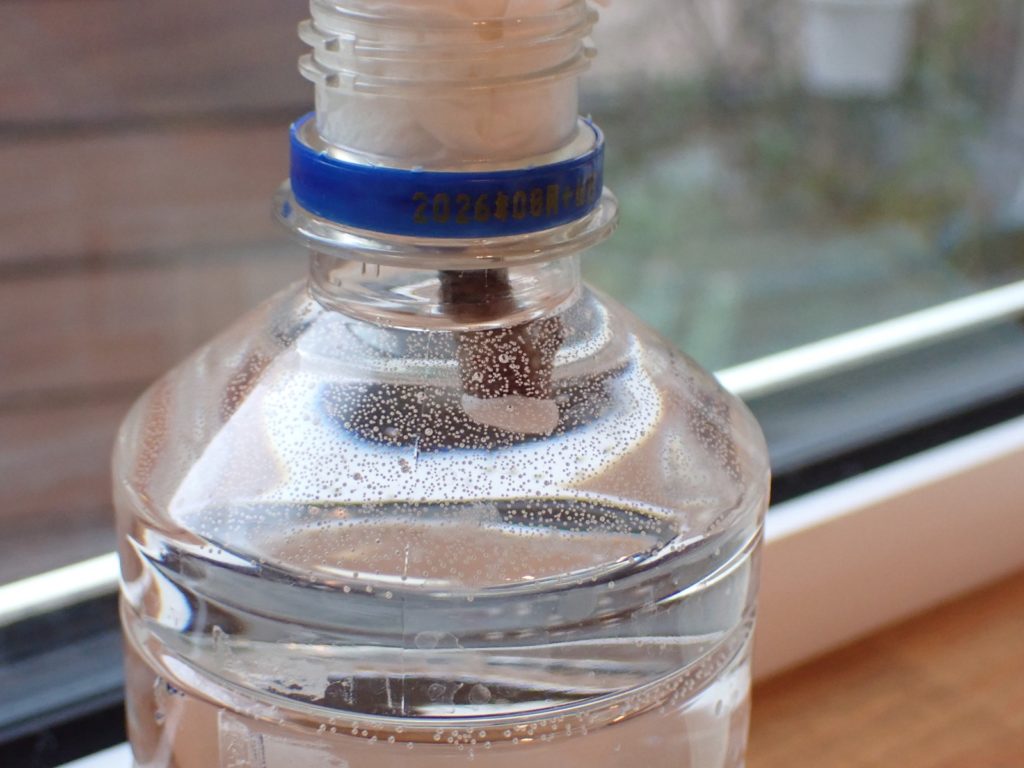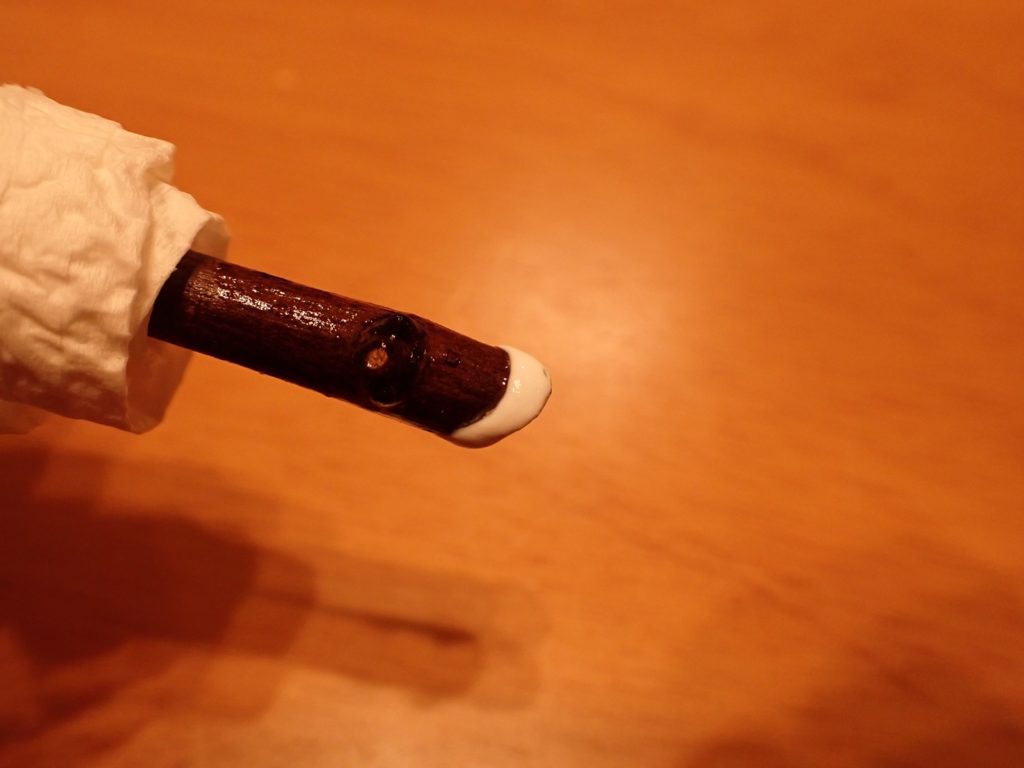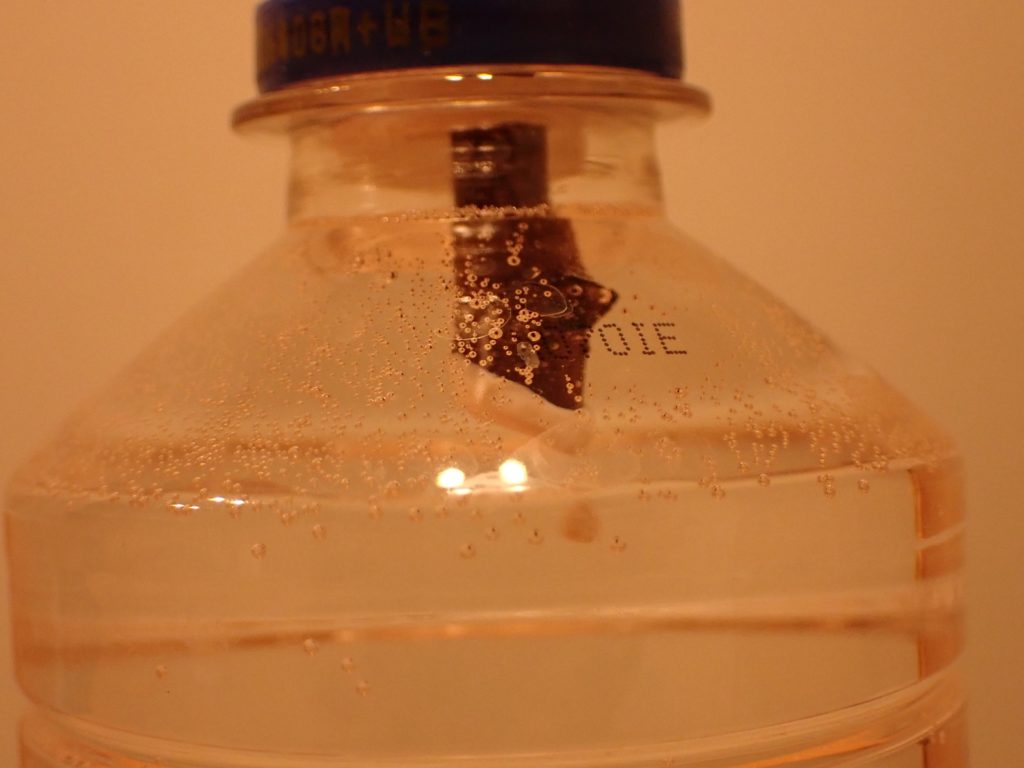 それから約7時間.ボンドは溶けて逸散してしまうのかと思われたが、依然切り口を覆い続けており、そして水から取り出して触ってもすぐ脱落する感じではない.どうやら少なくとも、一度固化したボンドは水に浸っても逸散はしない模様.