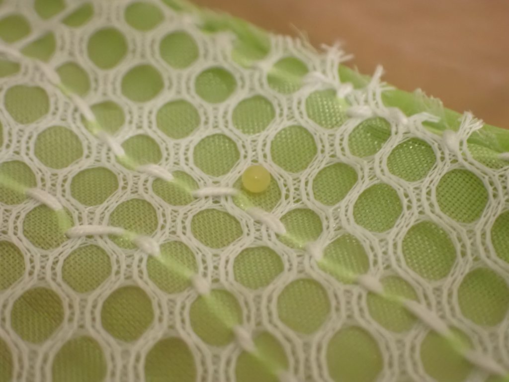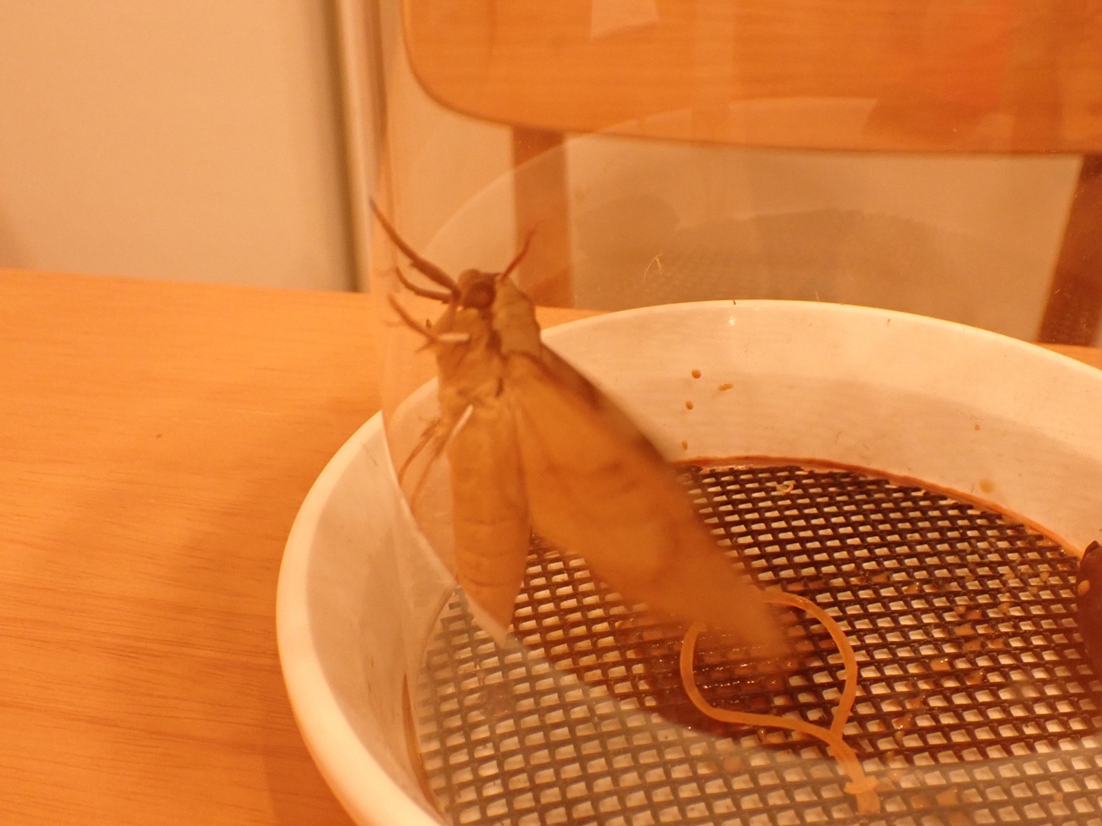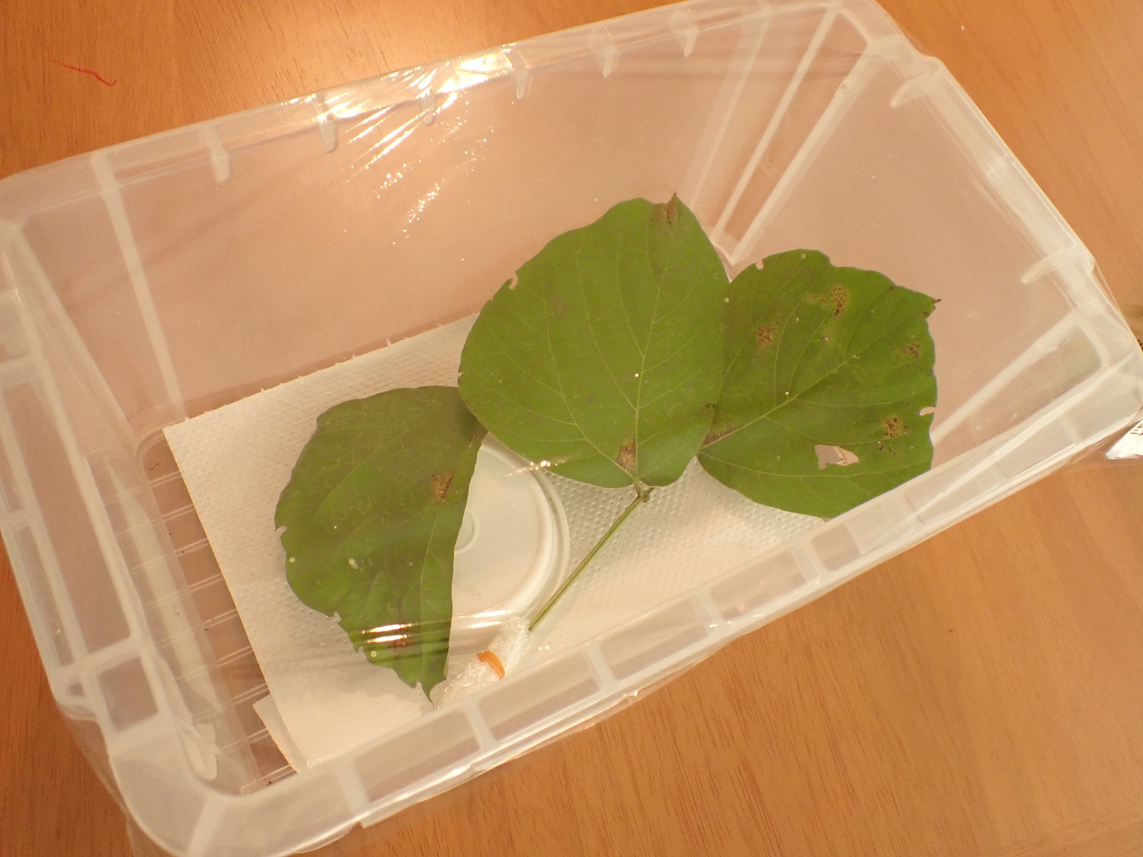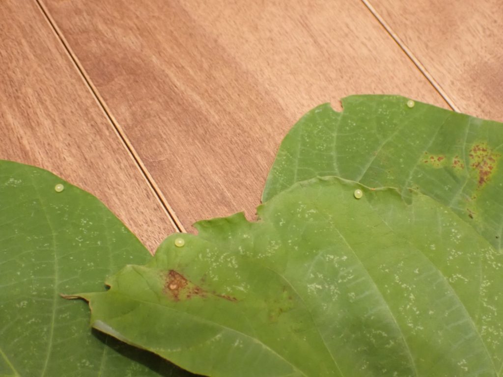 2025/07/08 トビイロスズメ 2025/07/09昆虫トビイロスズメasahama 未明 3頭目が羽化していた(すでに完了).雄. 朝-卵の確認 葉に計4粒、カゴに1粒. カゴの卵は葉にくっつけて、卵らは葉ごととりあえず保湿(孵化する頃にはきっと取り替える).