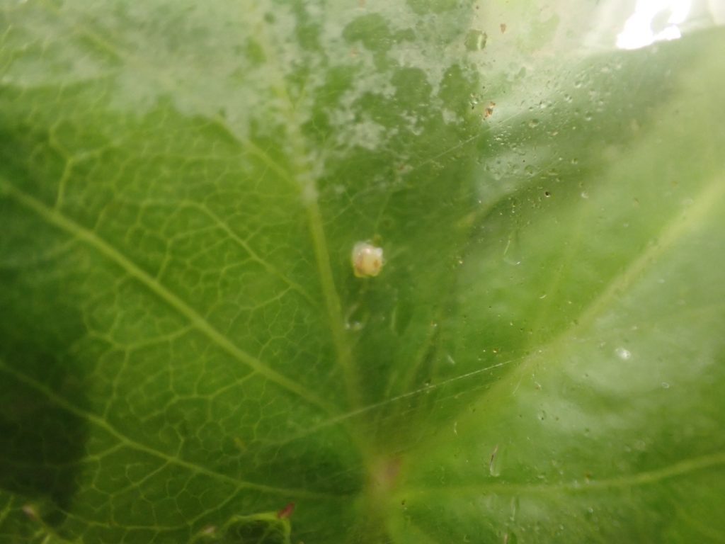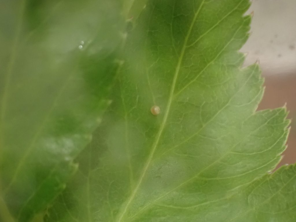(ケース・ラップ越しに撮影)卵の頂点に1点と、赤道の辺りにぐるりと褐色の模様が現れてきた.