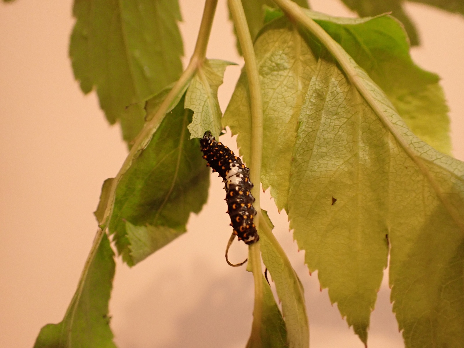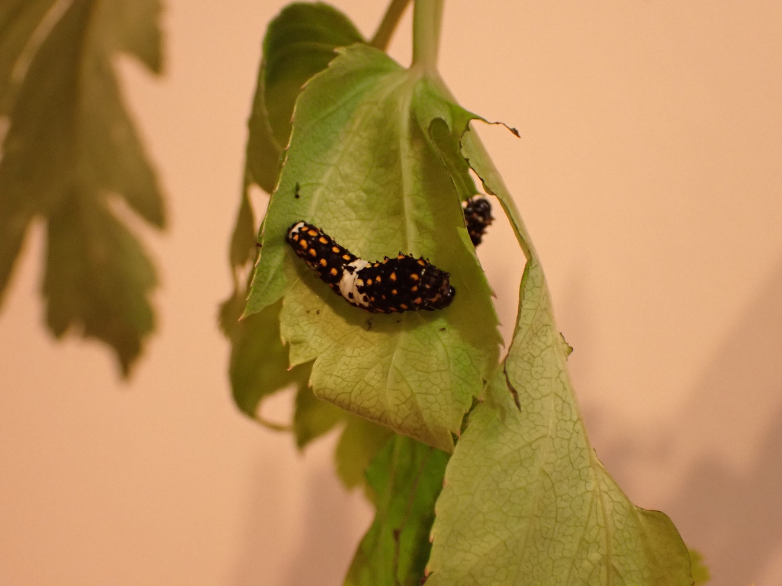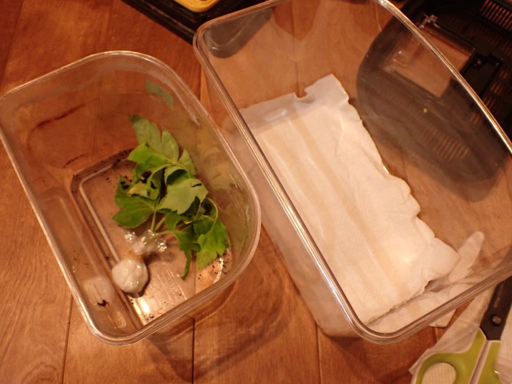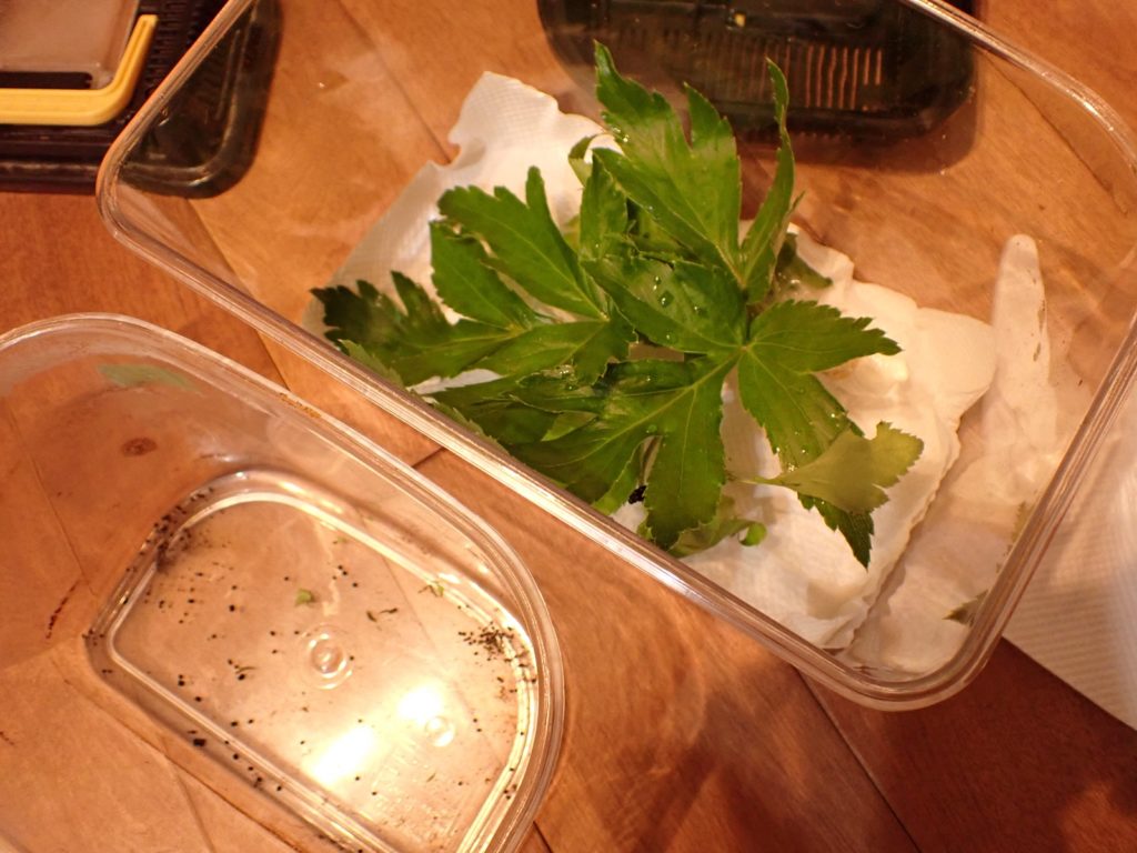 2025/09/25 キアゲハ成長中 2025/09/25昆虫キアゲハasahama 3齢 成長に応じ、ケースを大きなものに変更. 体長は1.6cm程.右画像の個体は眠に入っている. これまで、卵から今まで使ってきた葉が限界の模様.新しい葉を補充した.