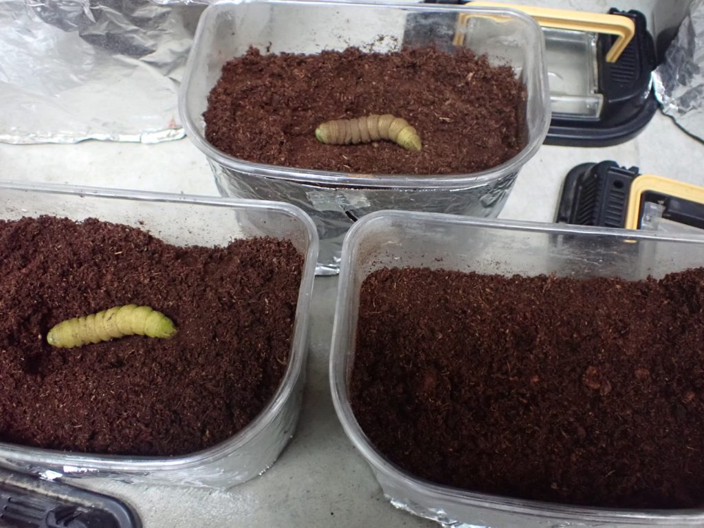 2025/06/16 トビイロスズメ蛹化 2025/06/16昆虫トビイロスズメasahama 2頭で確認 朝はまだ前蛹だったが(右下のものは幼虫が再び潜った) 夕方には蛹化.後で性別を確かめてみよう.