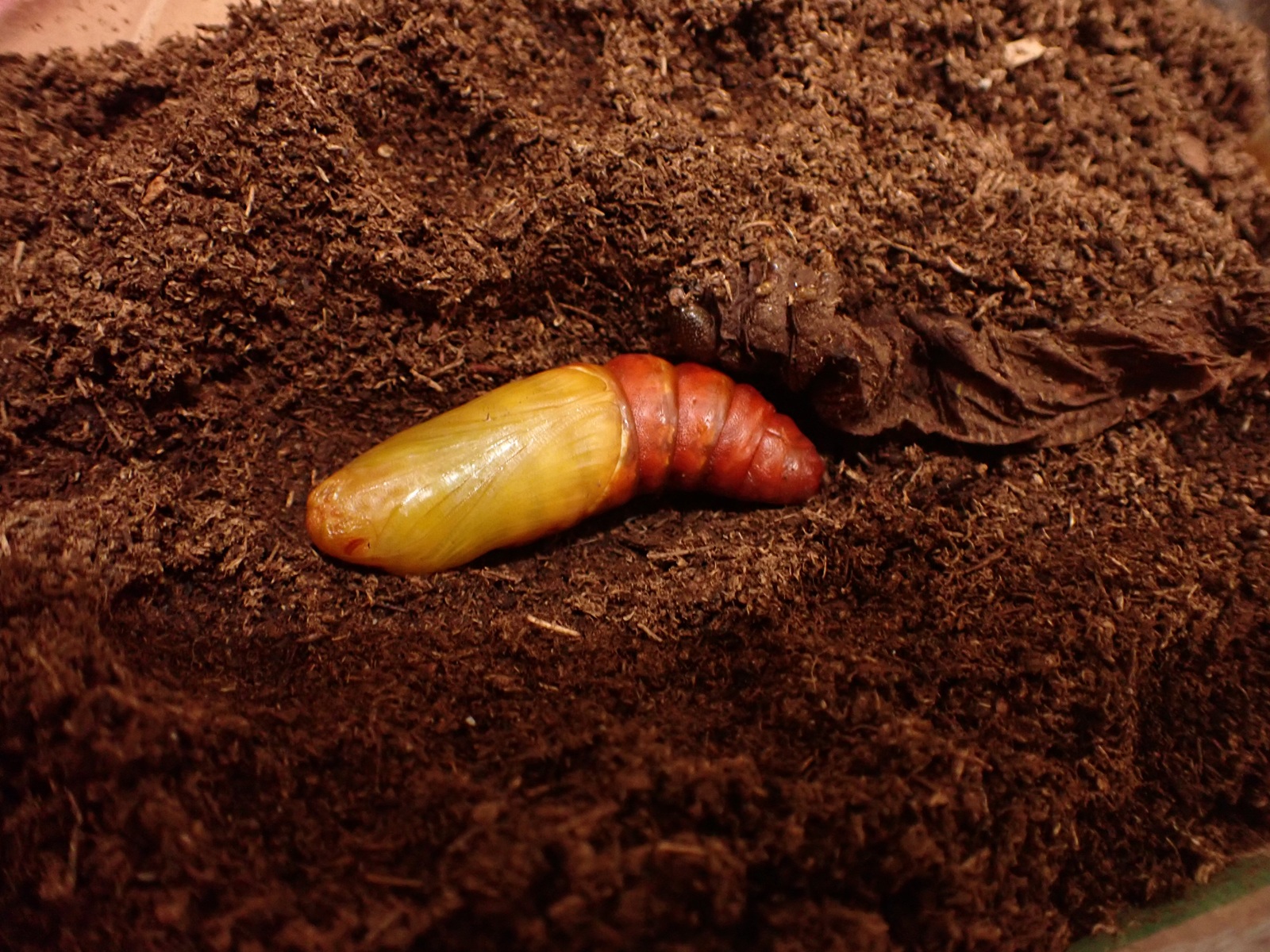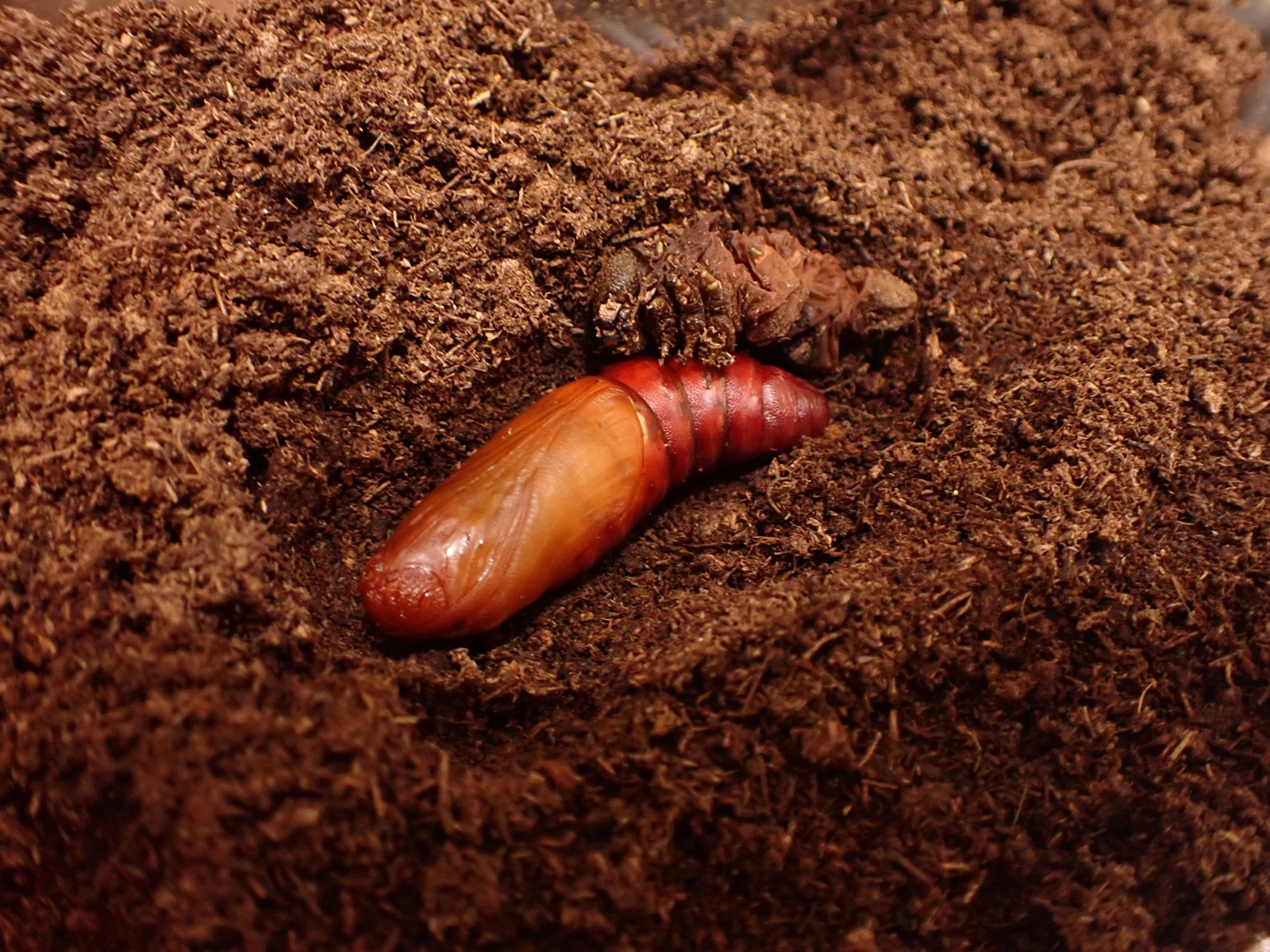 2025/06/21 トビイロスズメ蛹状況 2025/06/21昆虫トビイロスズメasahama 3頭目も蛹化 脱皮殻 先週の時点では幼虫だった最後の1頭(3頭目)も、確認すると蛹になっている事を確認した. 雌雄の判定 No.1 No.2 No.3 本日蛹化を確認した1頭(No.3)は、「へそ」のような小さな窪みと肛門の窪みとの距離が先に蛹化した2頭(No.1, No.2)よりも近い.どうやら当初の見立てと違い、先に蛹化した2頭が雌、今回蛹化を確認した1頭が雄の模様.