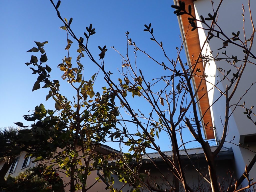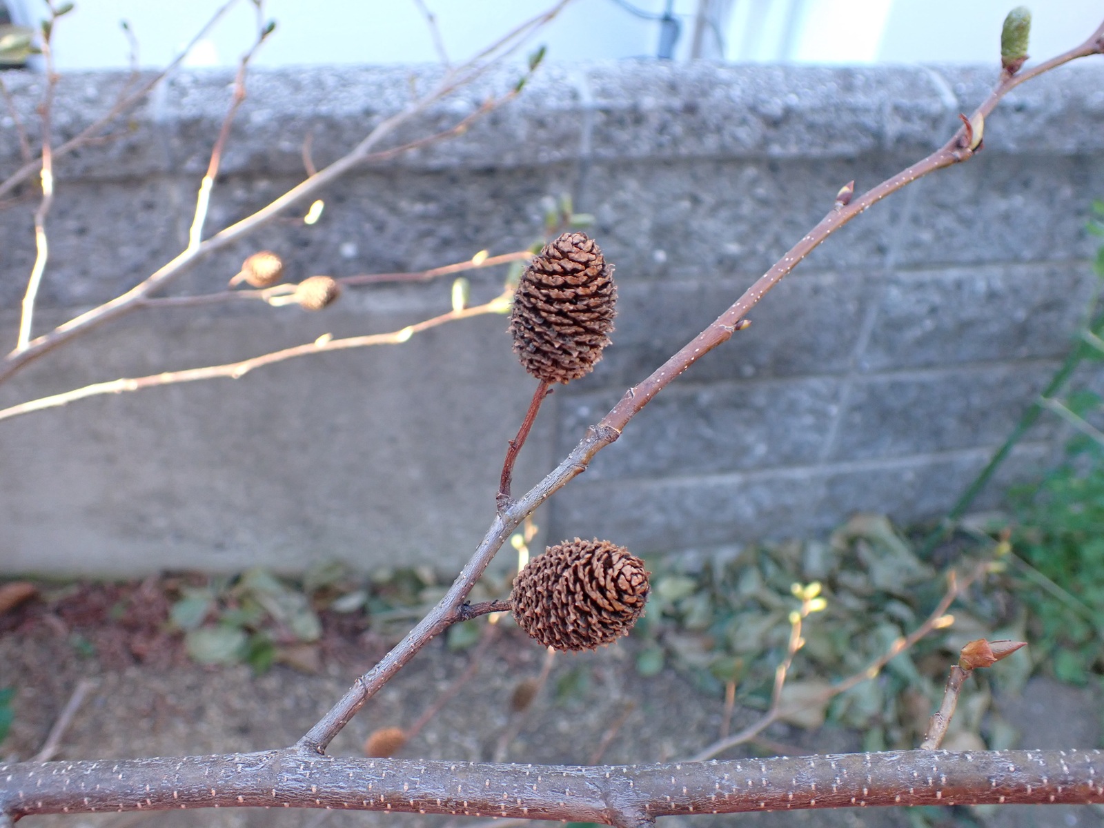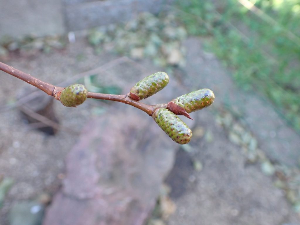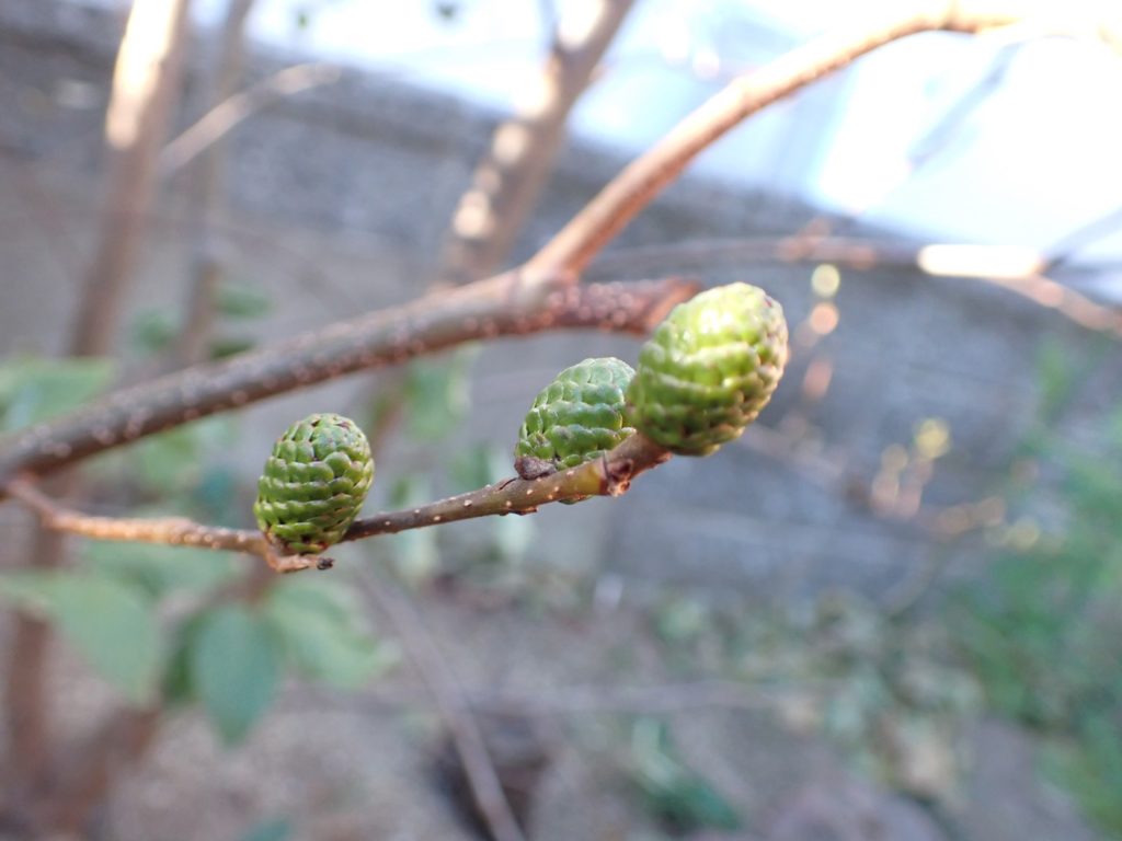 2026/01/24 庭のヤシャブシ 2026/01/24庭、植物ヤシャブシasahama 実・花序の様子 昨年から着いていた実が熟して開いている. 種としては同じ「オオバヤシャブシ」だと思うのだけど、片方(画像右)は既に葉がすっかり落ちているのに対し、もう片方(画像左)はまだ沢山の葉が付いている.個体差かな. (↑画像左の株) (↑画像右の株) 雄花序にも若干の違いがある.片方は細長くヤニでしっかり覆われている感じであるのに対し、もう片方は丸みがありヤニが薄くて凸凹が大きい印象.