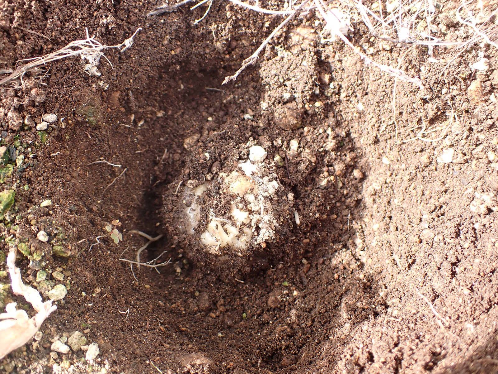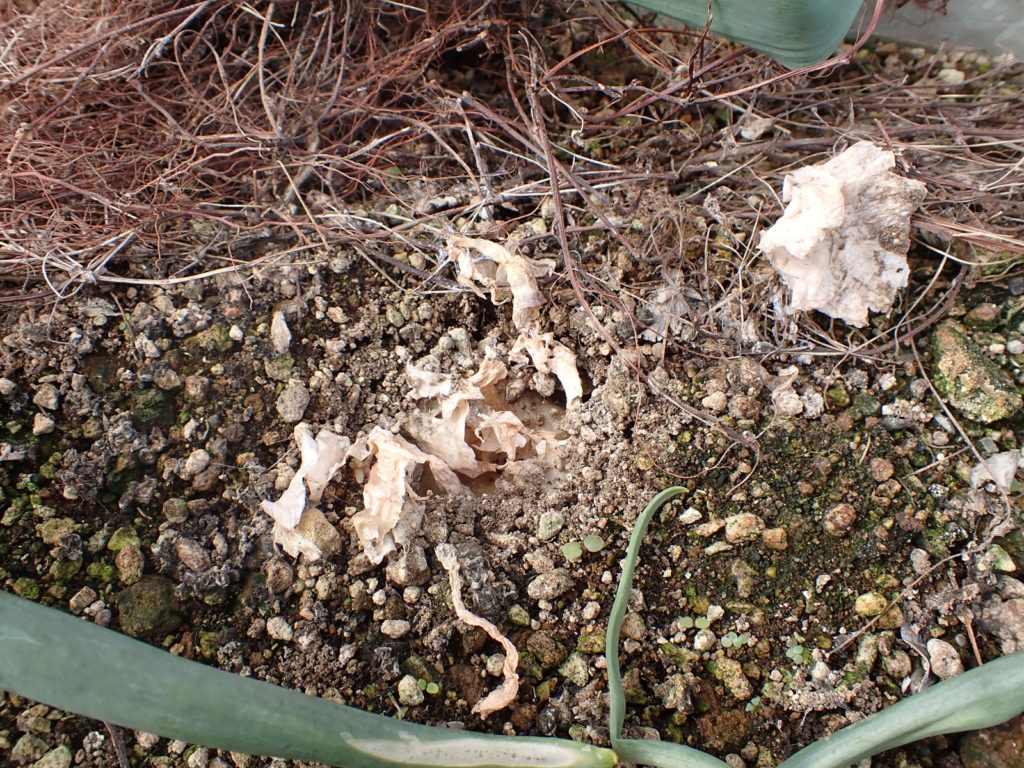 いつまでも芽が出てこなかったので、思い切って調べてみたら・・・赤玉は全体が腐敗し、ムソナは消失.残念ながらどちらも芽を出すには至らなかった模様.