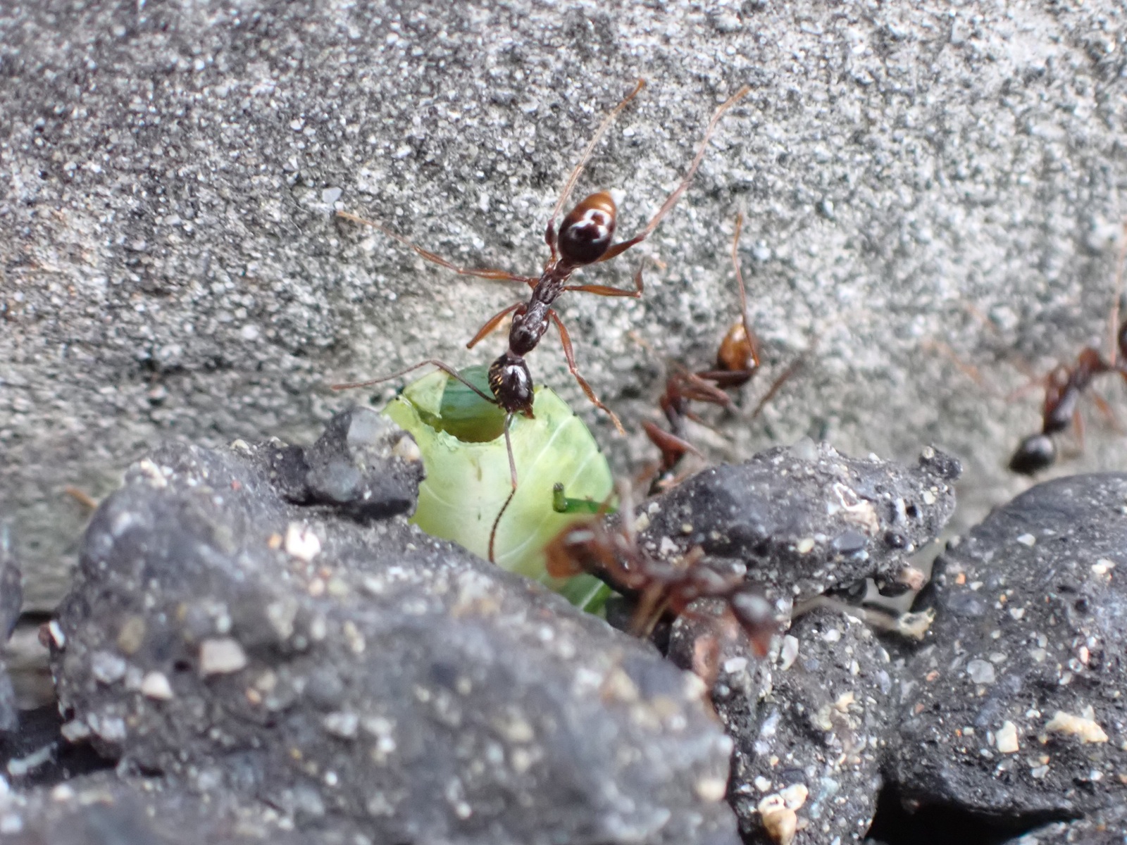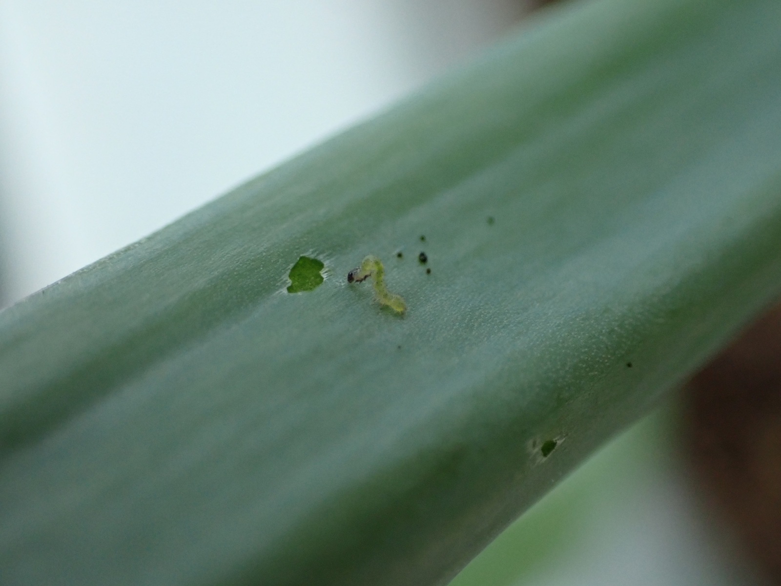 発芽中の玉ねぎ先端に付いている種子の殻に、小さなカメムシがひっついていた.見ると口を差し込んでいる模様.口、結構長い.どうも以前ヒマワリの花に集っていたものと同種に見える.ヒメナガカメムシの仲間かな.