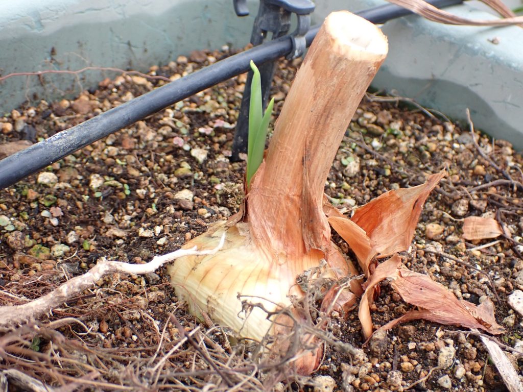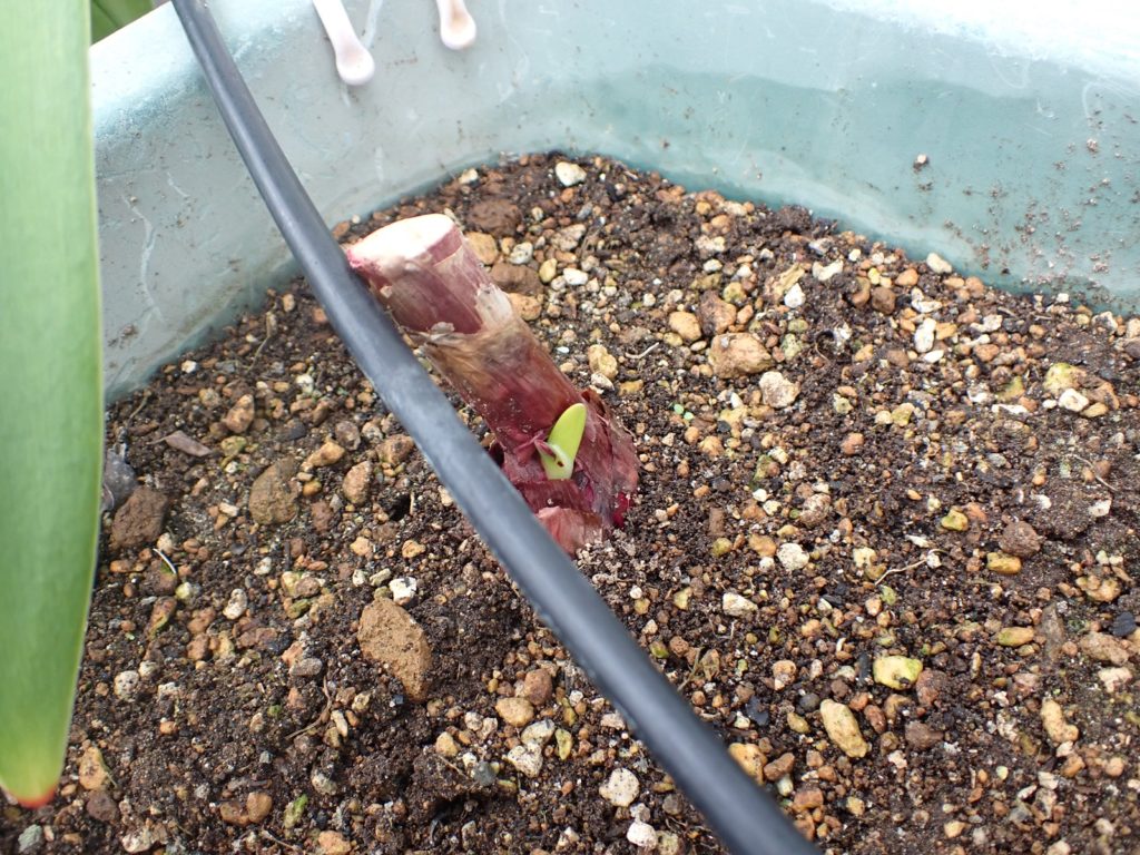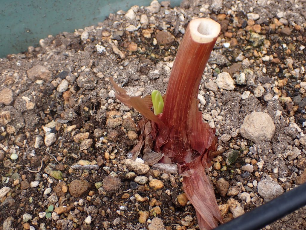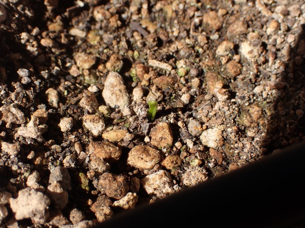一方、こちらは親.3球中2球で出芽したが、1つは葉色が薄くて食べやすかったのか、何者かに齧られていた.ナメクジか?