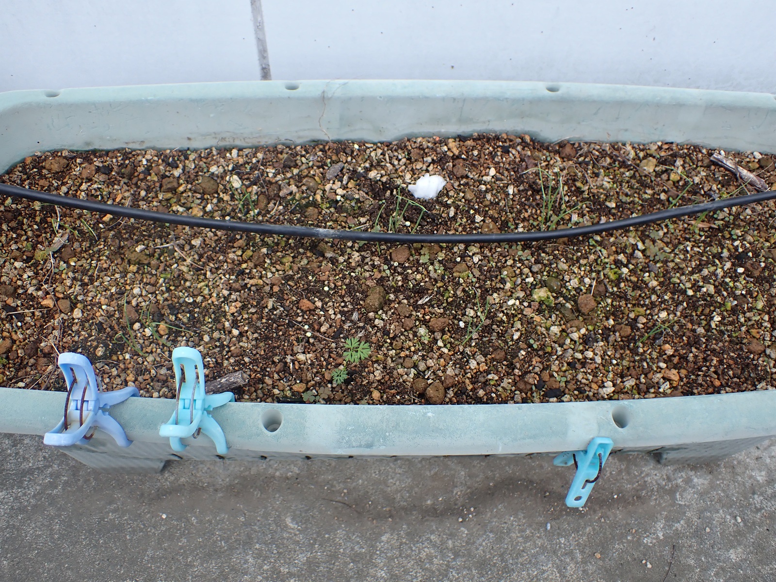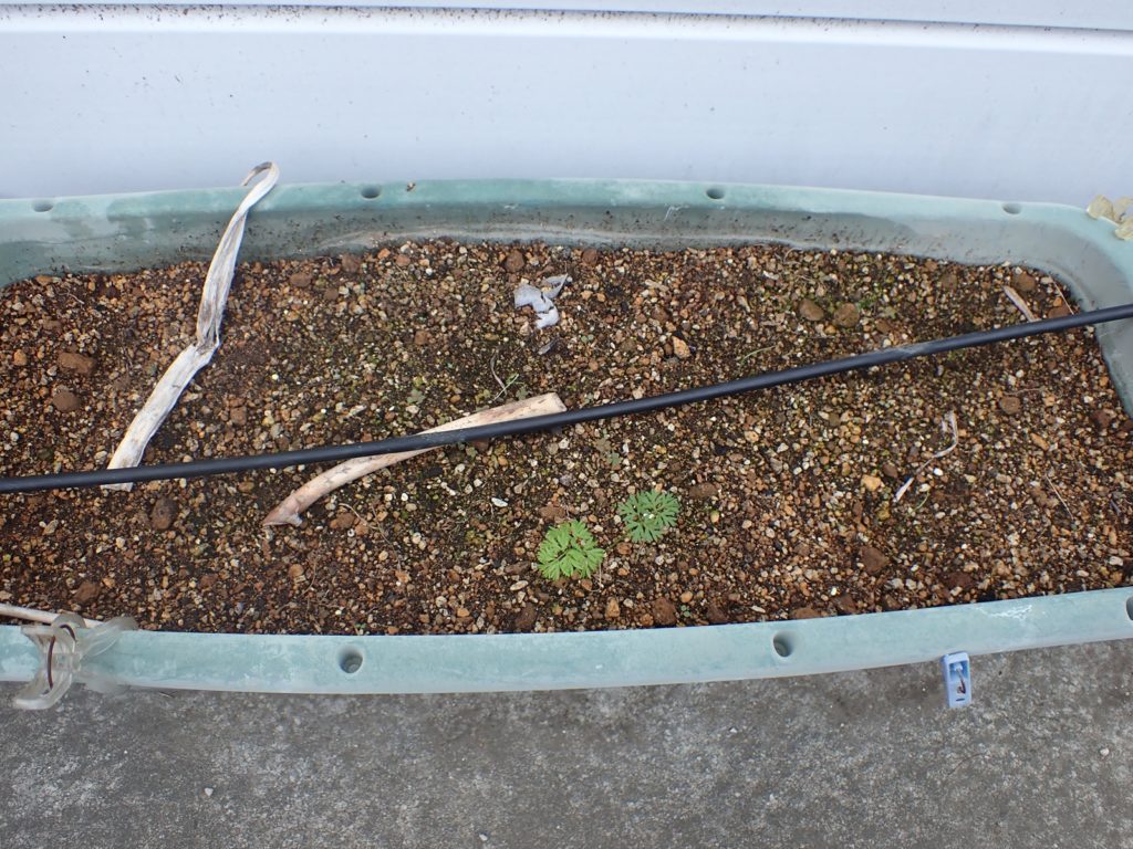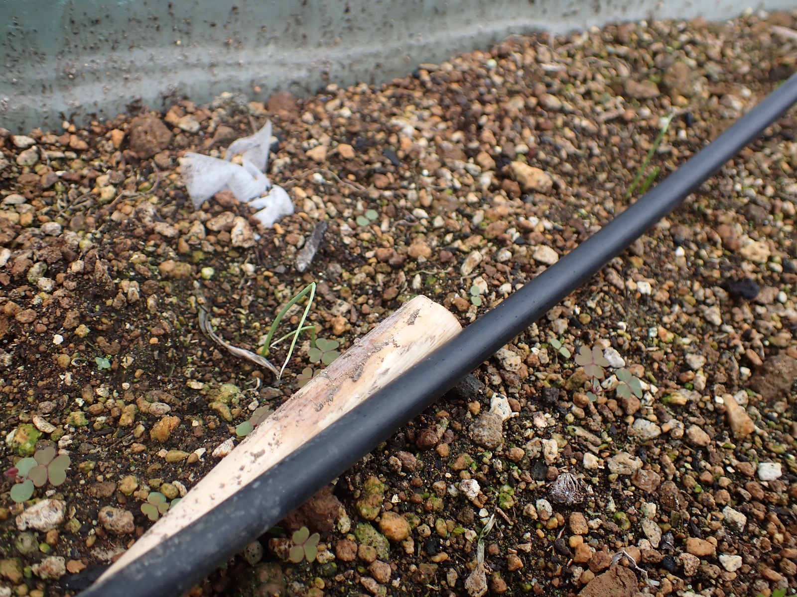 矢印の辺りで不自然な土の盛り上がりや窪みが見られる.コガネムシが侵入したのではないかと危惧している.苗達は逃げ切れるだろうか?