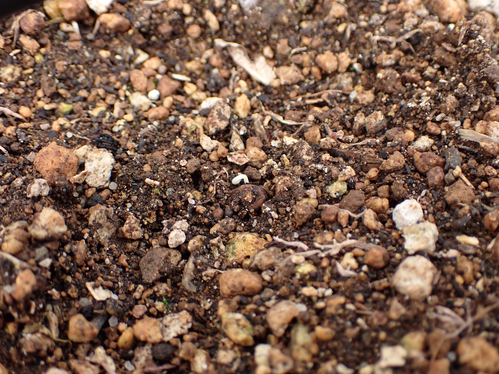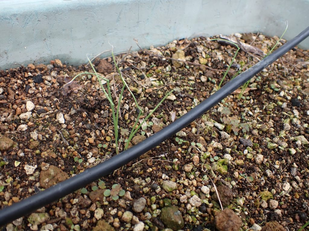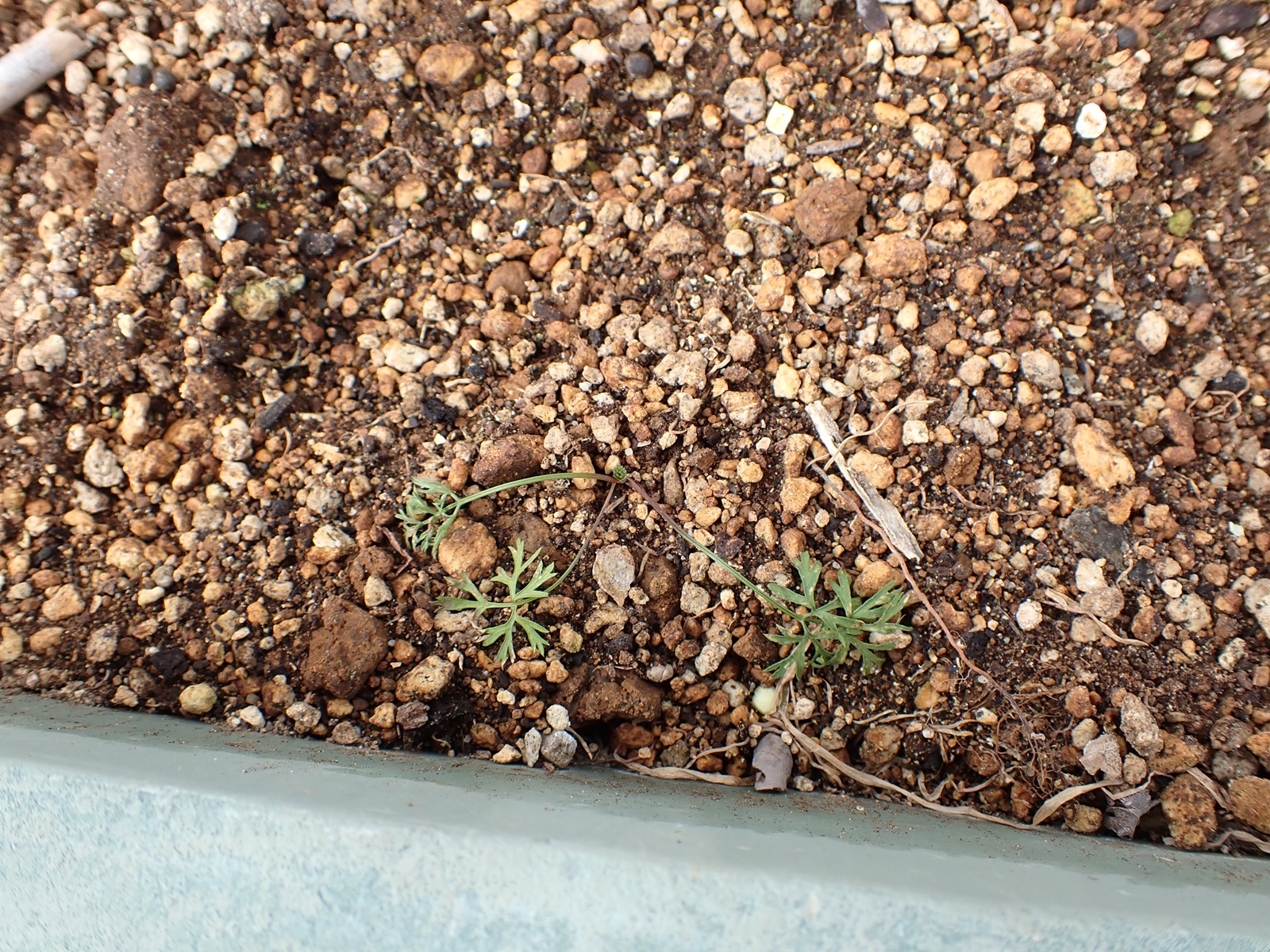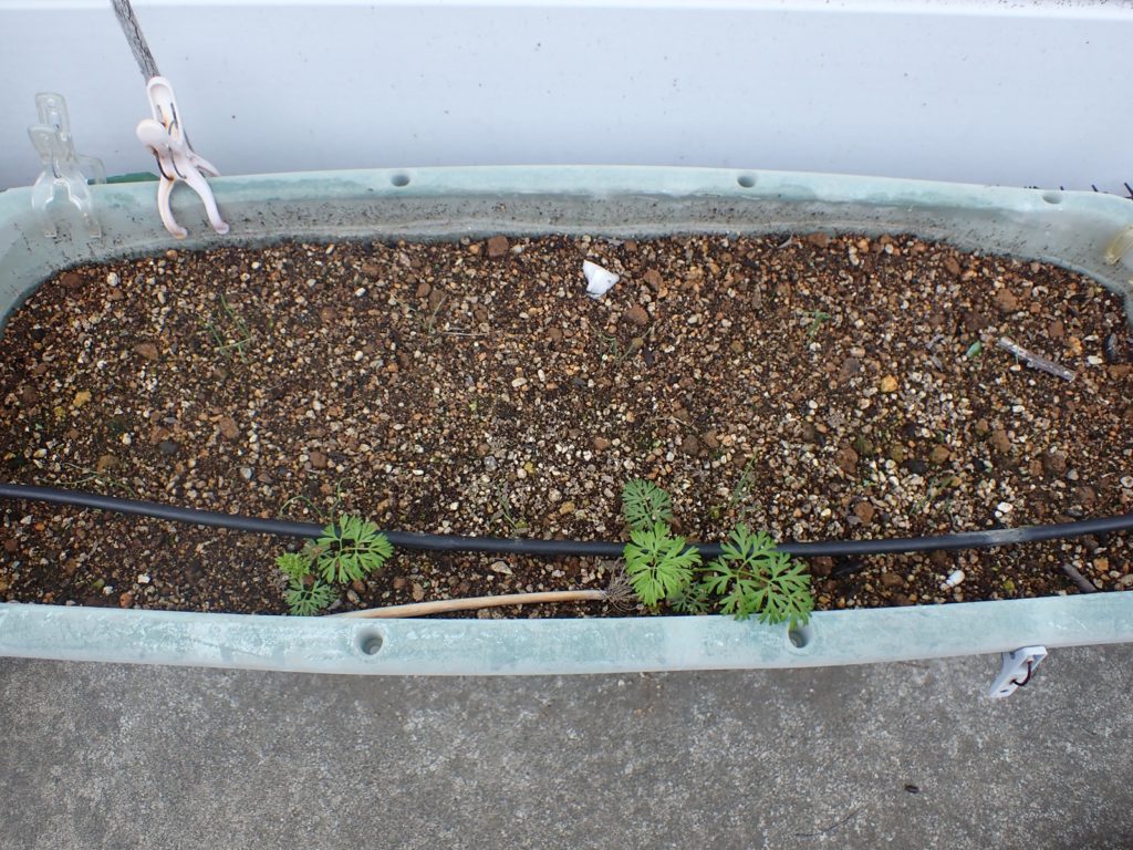 矢印の辺りで不自然な土の盛り上がりや窪みが見られる.コガネムシが侵入したのではないかと危惧している.苗達は逃げ切れるだろうか?