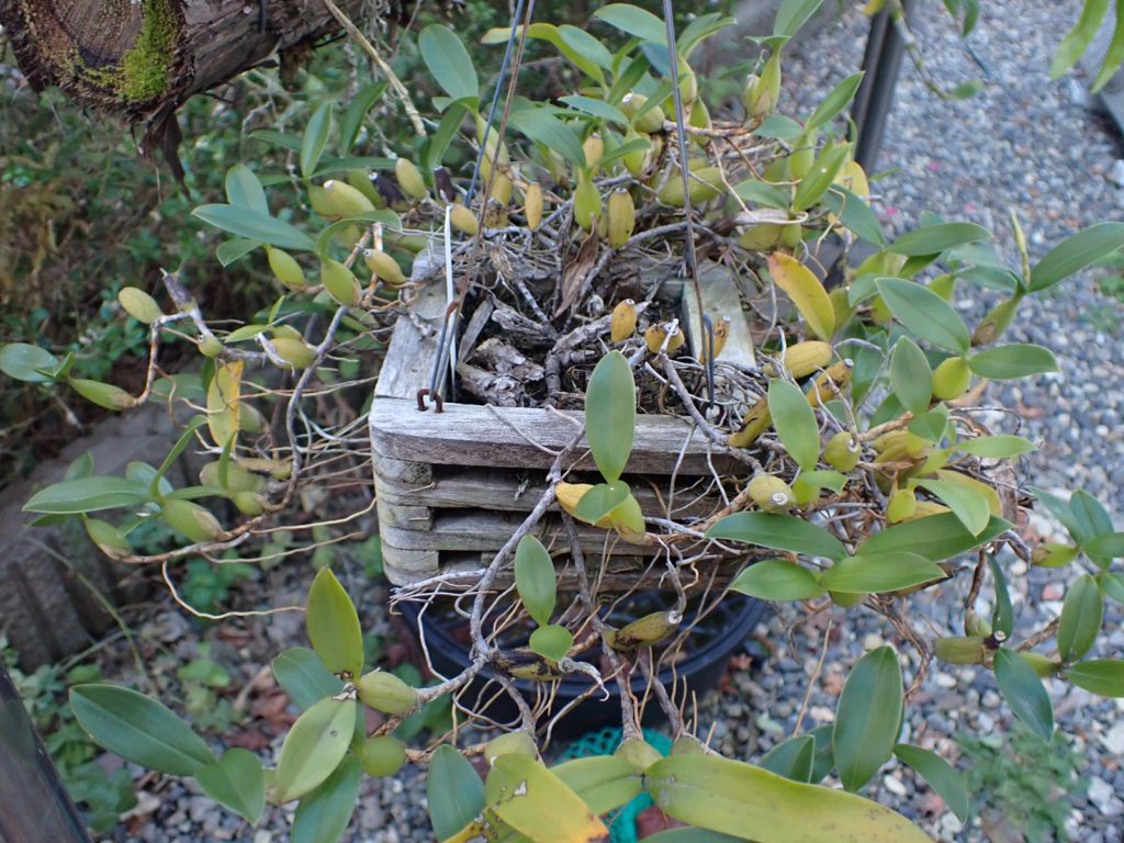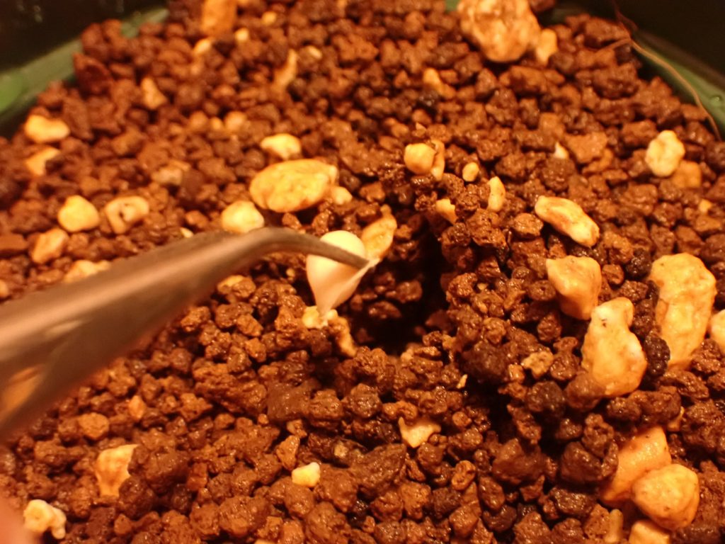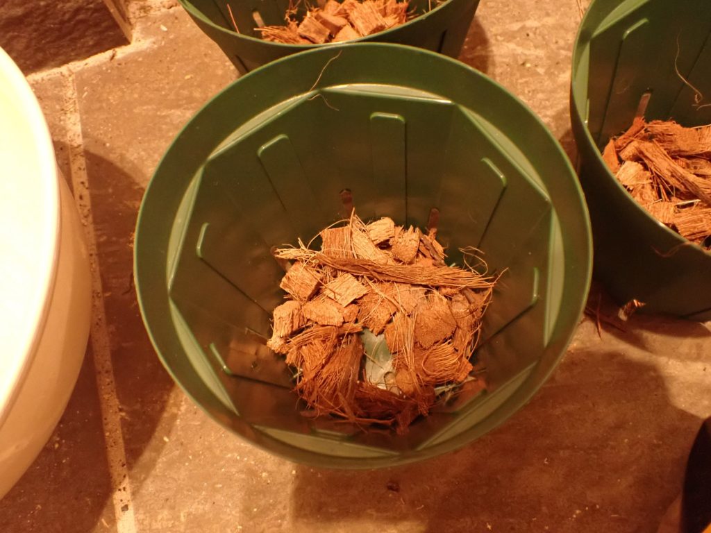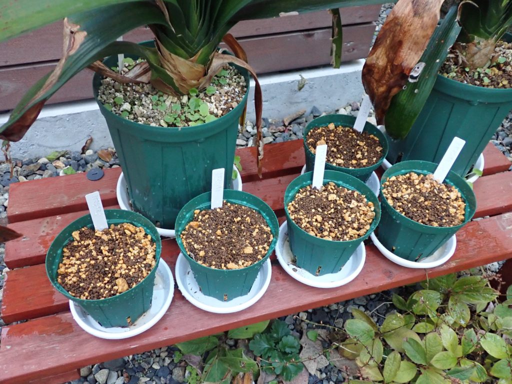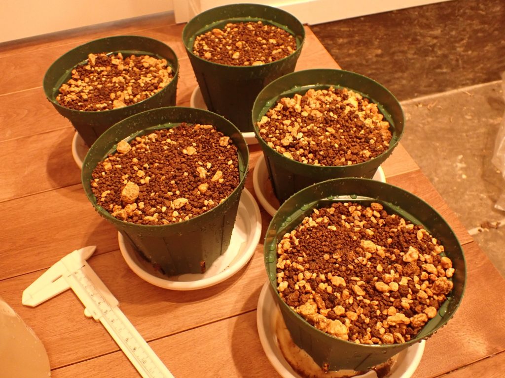 鉢はスリット5号ロング.用土の配合は赤玉2:鹿沼1:腐葉土2.マグァンプはいつもより少な目.腐葉土を使うのは当方では異例だけど、過去の失敗と生息環境を鑑みて使用に踏み切り、用土はいつになく黒々となった.スリット鉢における用土の土こぼれ対策として、底の方にビニル袋を作業が終わるまでぴったりはめておく(それでも少しこぼれるけど、しない場合より発生量を大きく抑えられる.こぼれた分は鉢の上にまた足す).