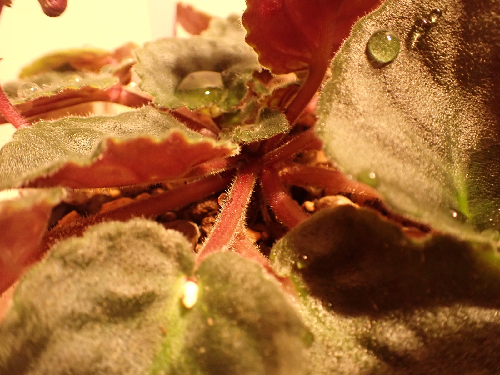 植え込みまで終わり、さあ水を通そうというときに、葉に虫が巣くっている気配を認めた.ピンセットで探ると小さな蛾の幼虫が見つかったので、お引き取り願った.そして水を鉢に通した.