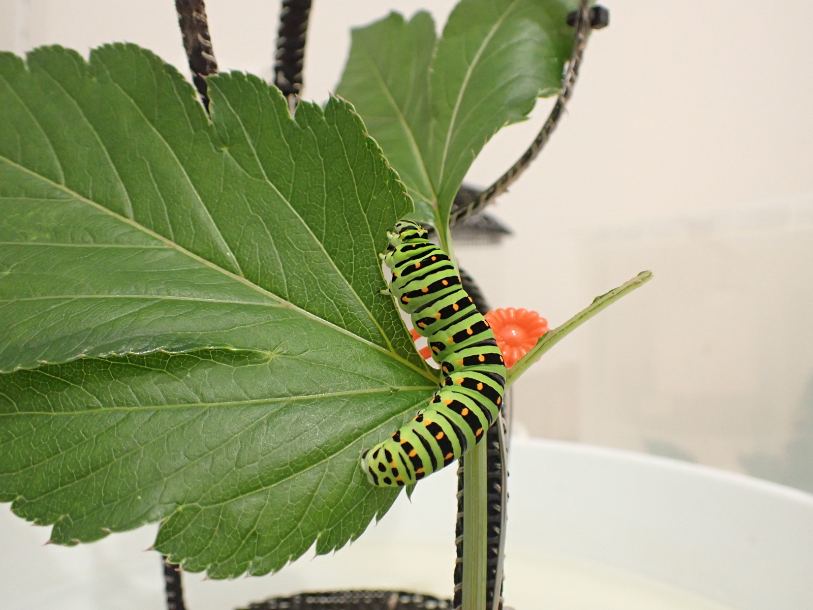 2025/07/07 キアゲハ状況 2025/07/08昆虫キアゲハasahama アシタバ補充 鉢植えのパセリの種を採りたいという妻の要望で、まだ付いていた別の個体(終齢)も前の晩こちらに取り込んだが、餌として入れていたパセリ(若い果実)はあっという間に食べつくされたので、近所の野良アシタバの葉を採取してきた. どちらの個体も喜んで(?)食事を始めた. この日の夕方、終齢が蛹化の為に定位していた.