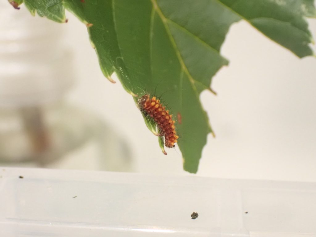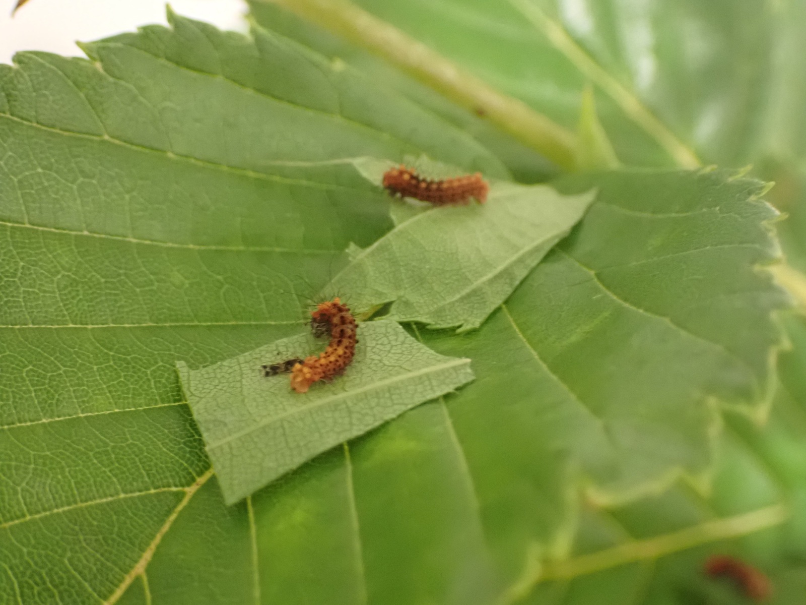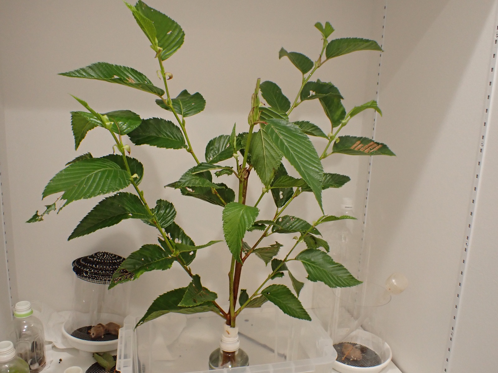 2025/08/30 オナガミズアオ成長中 2025/08/31昆虫オナガミズアオasahama 2齢 交換前 交換後 葉はまだ沢山付いているが、枝のくたびれが強くなってきたので新しい枝に交換した. 新しい枝への移動は、幼虫らを古い葉ごと(切り取って)新しい葉に乗せる方法で実施.