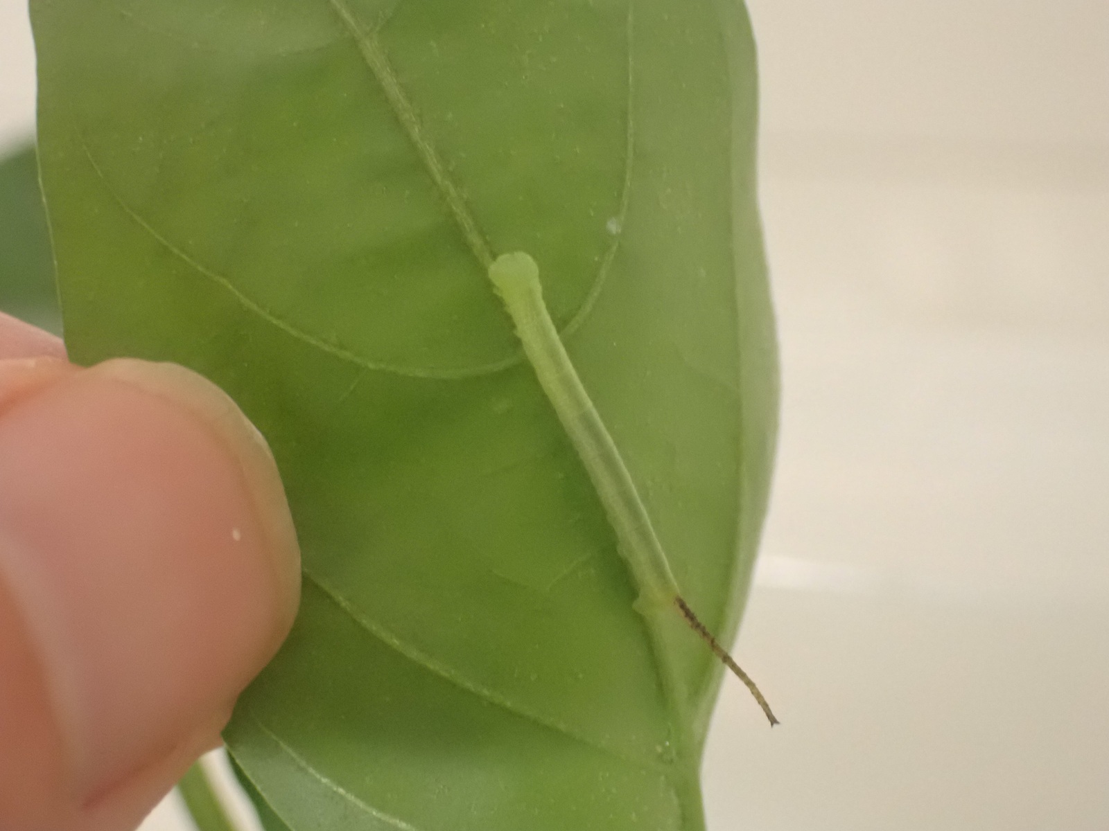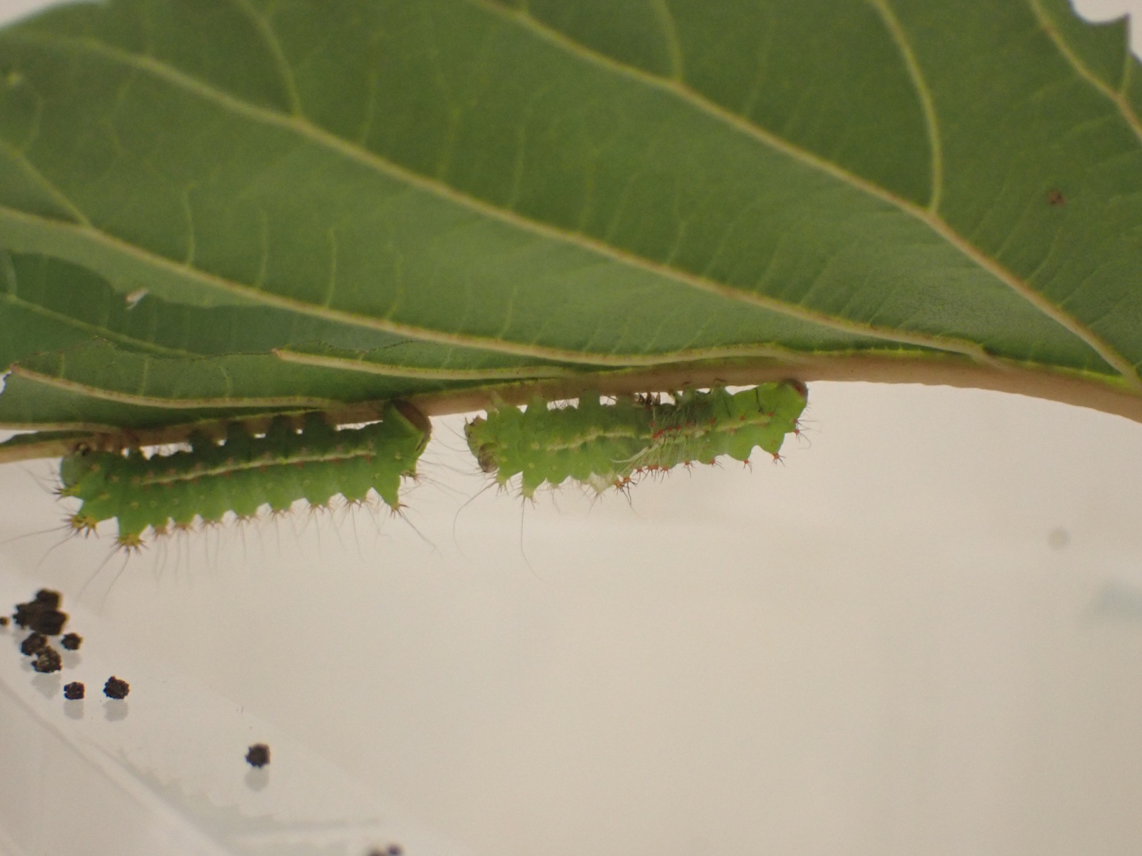 2025/07/24 蛾3種 2025/07/24昆虫オナガミズアオ、クロメンガタスズメ、トビイロスズメasahama クロメンガタスズメ(仮)・トビイロスズメ クロメンガタスズメ(仮) トビイロスズメ どちらも3齢.トビイロは体長2cm程であるのに対しクロメンガタ(仮)は体長4cm程.この時点で大きな差がついている. 2025/07/29 追記:クロメンガタスズメ(仮)はクロメンガタスズメと確定 オナガミズアオ 5齢現る.