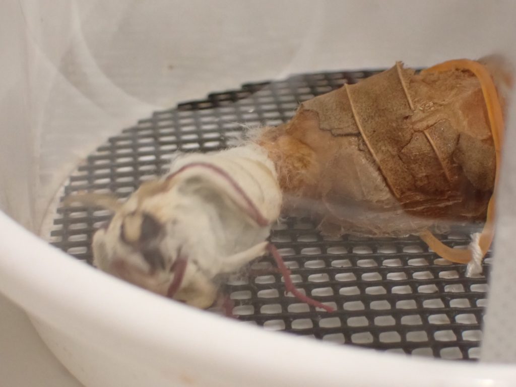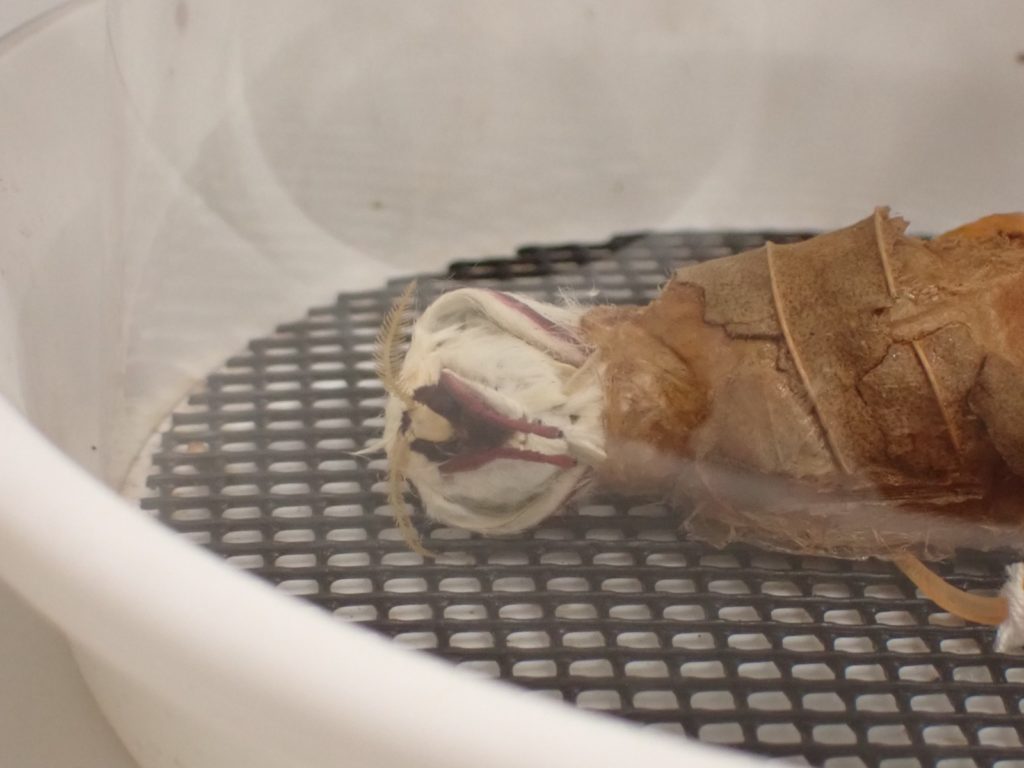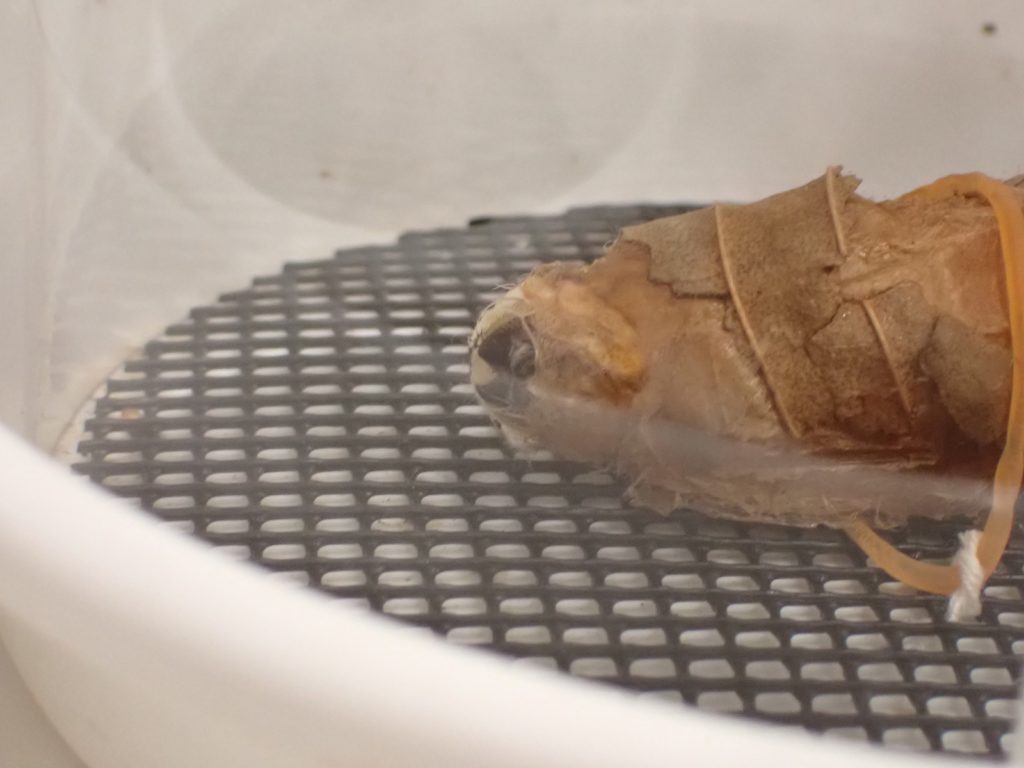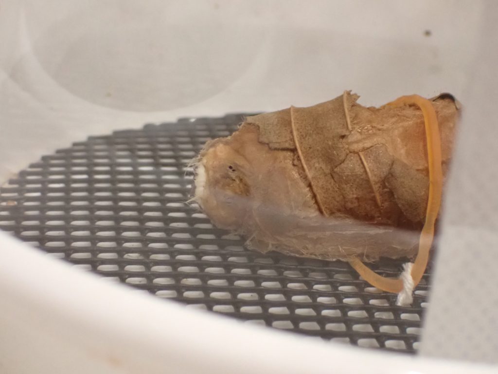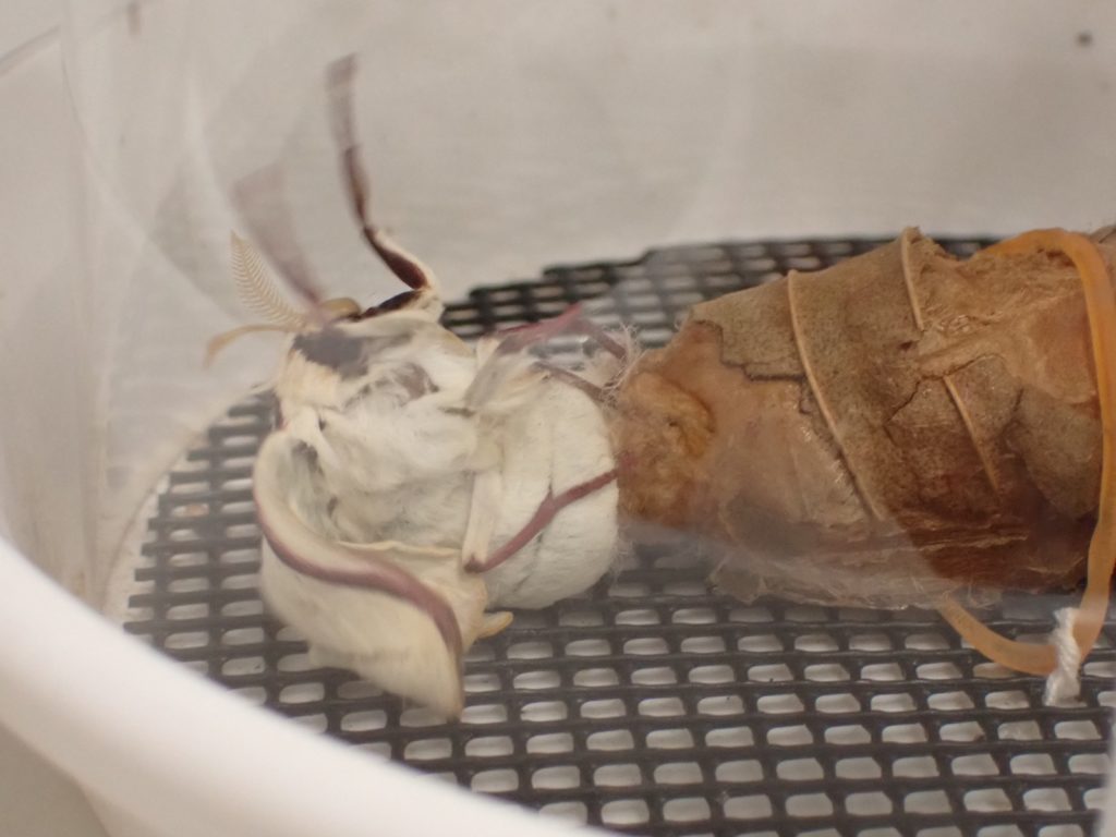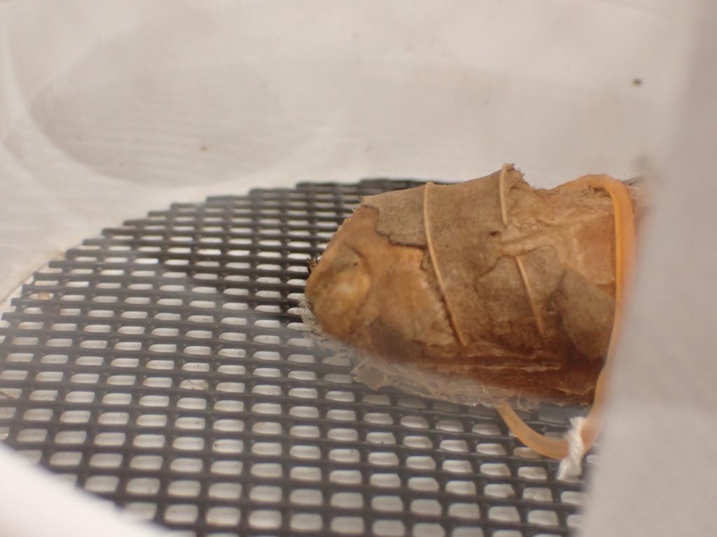 3番目羽化.雌.繭からの脱出の様子を観察できた.驚いたことに、わざわざ用意した天井への足場を使わず、ペットボトル材の垂直な壁面をいとも簡単に登って達した.