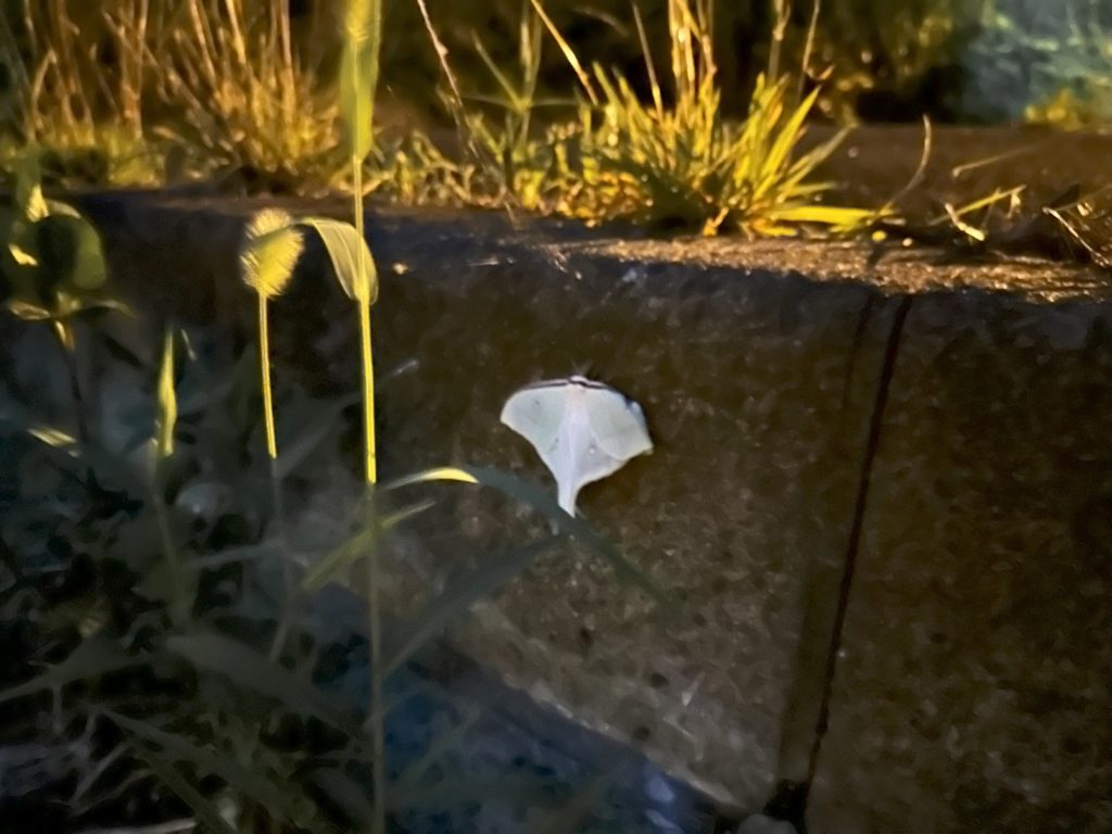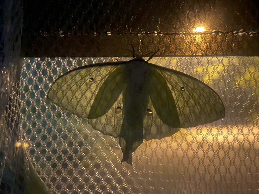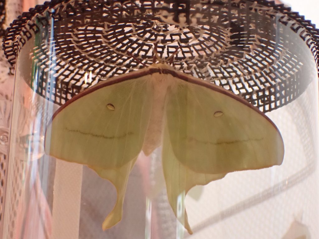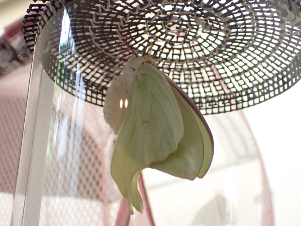 羽化不全の雄、飛べないのか試しに現地にて、カゴから飛び出すに任せてみたが、地上すれすれがやっとという状態だった(それでもすごいが).やはりカゴに戻ってもらった.