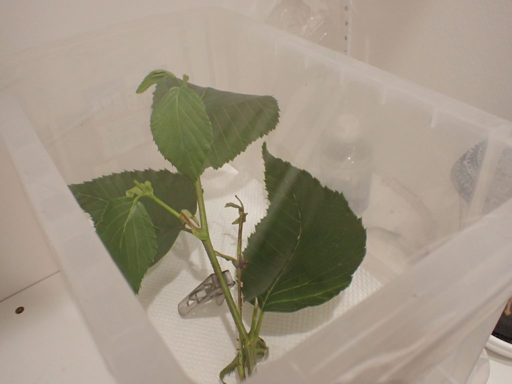 雌はカゴの下方へ移ってもらい、その間にヤシャブシの枝を天井にセット.