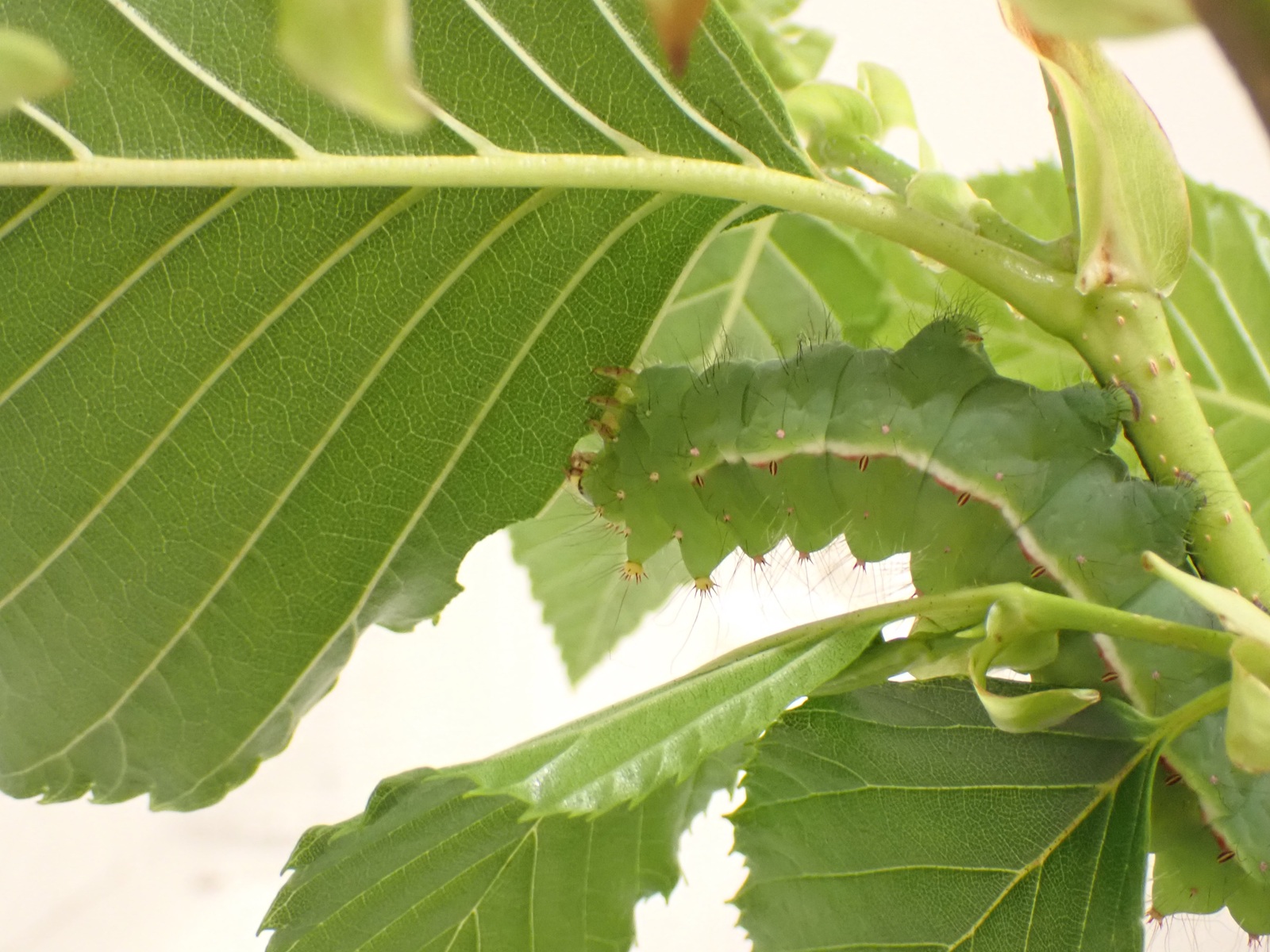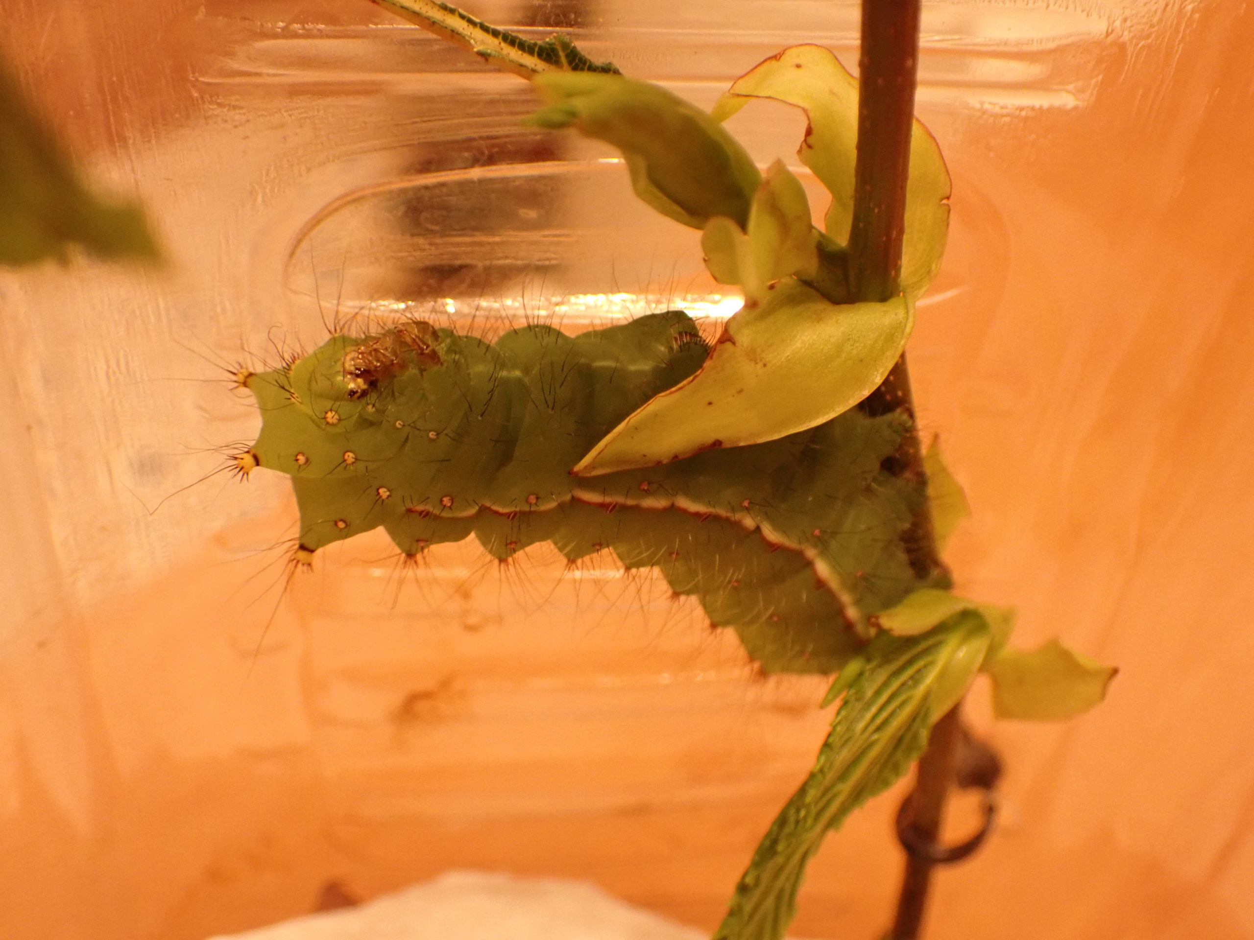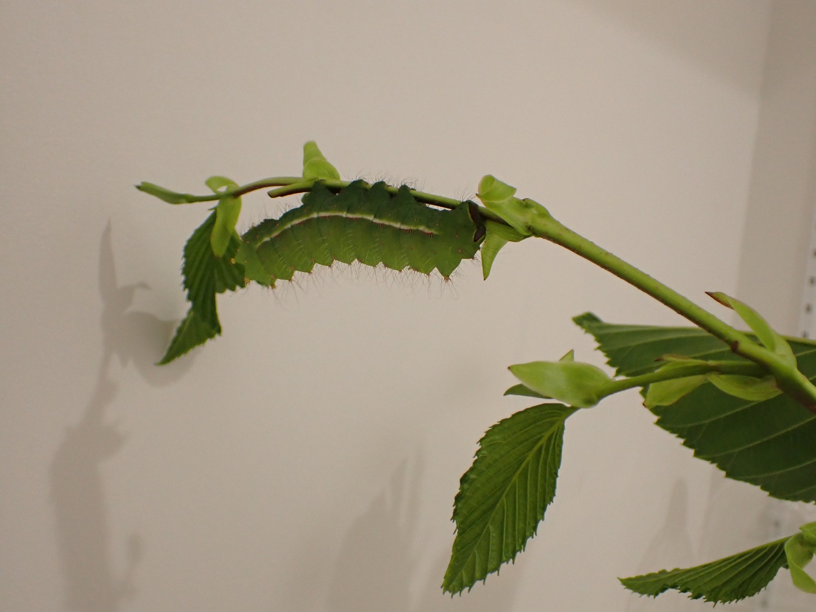 2025/06/13 オナガミズアオ全員上がり 2025/06/13昆虫オナガミズアオasahama 朝 6:07 7:26 朝、食べられる葉の無い枝先で佇み、イレギュラーなタイミングで上がりかと思われたが、その後移動し食事を再開. 夜 枝先付近で、かつ傍の葉を食べずに佇んでいたので上がりと認定.蛹化ケースへ収容となった.