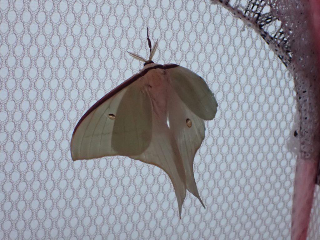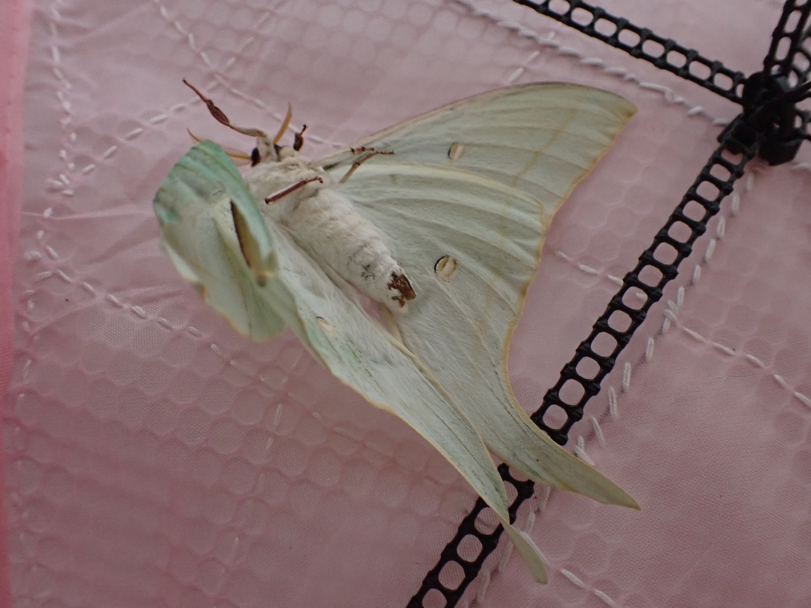 2025/06/28 オナガミズアオNo.2羽化 2025/06/28昆虫オナガミズアオasahama 雌 15:40 15:47 15:57 No.1と打って変わりこちらは無事羽化の運びとなった. 翅は一様に伸びるのではなく、前翅前縁→前翅後縁→後羽前縁→後翅後縁→尾状突起の順に伸びているようだ.大事な部位程先に伸ばすという所かな. 17時過ぎには翅を広げて羽化完了.お見合い&産卵かごに移動.この夜お見合いに臨む.どうなるかな?