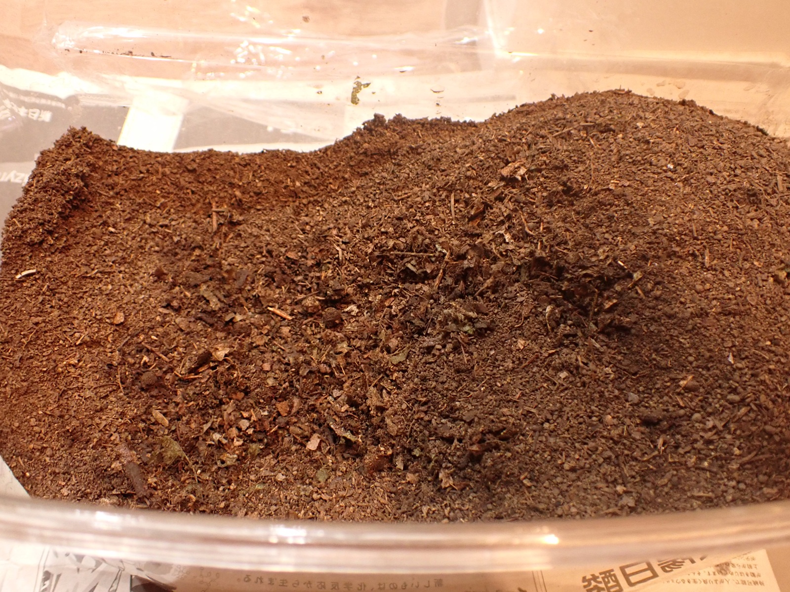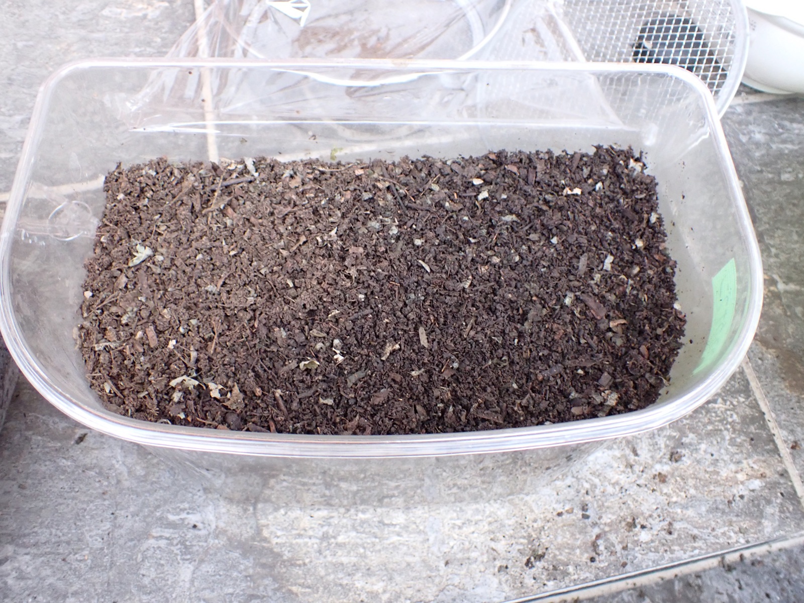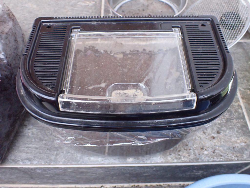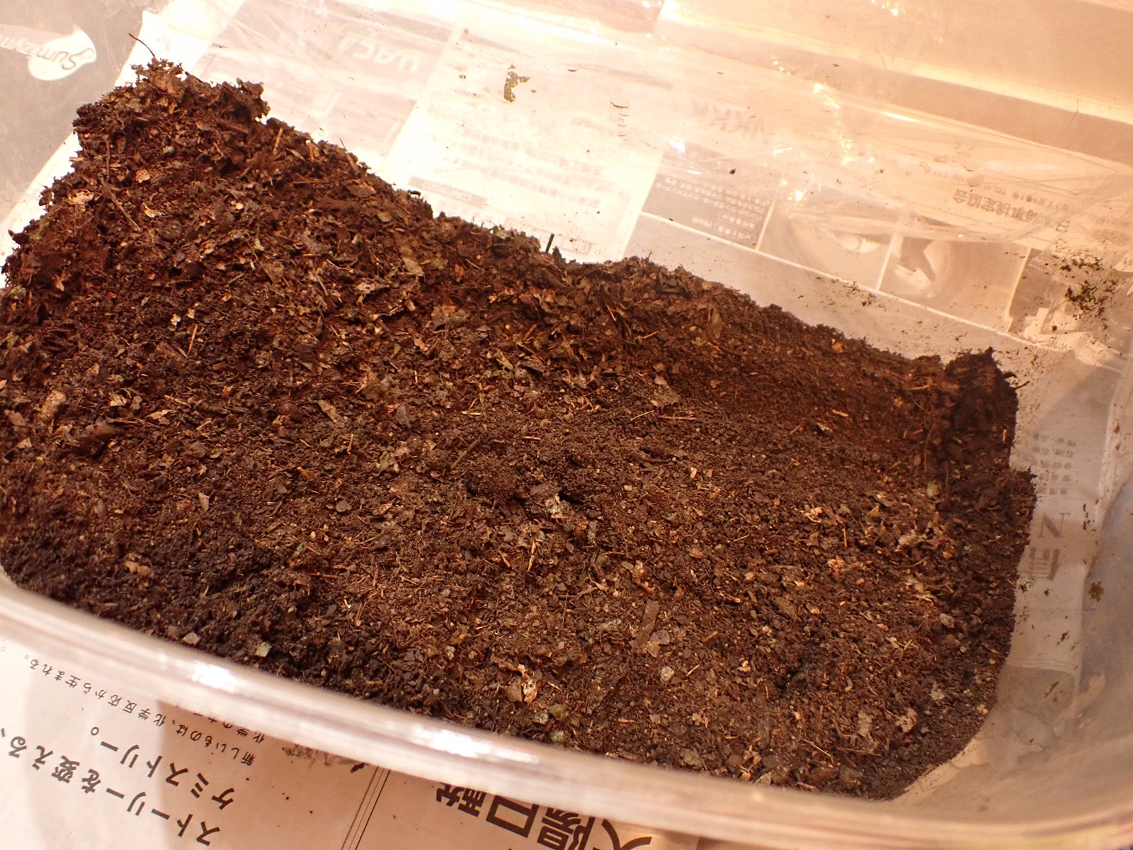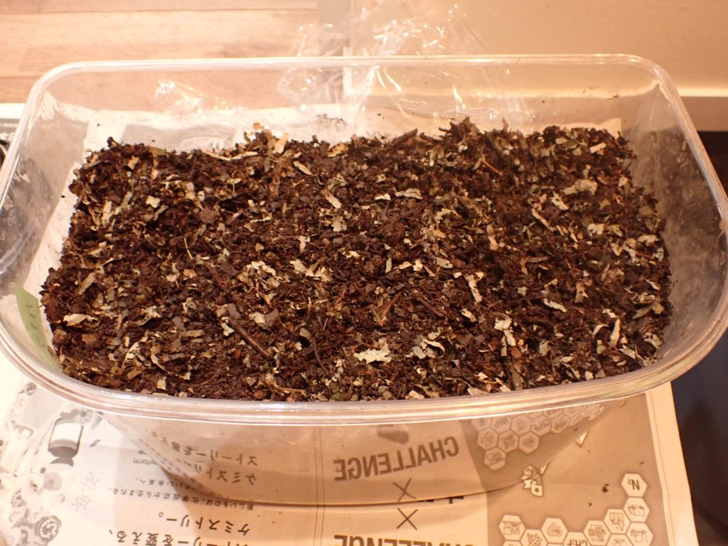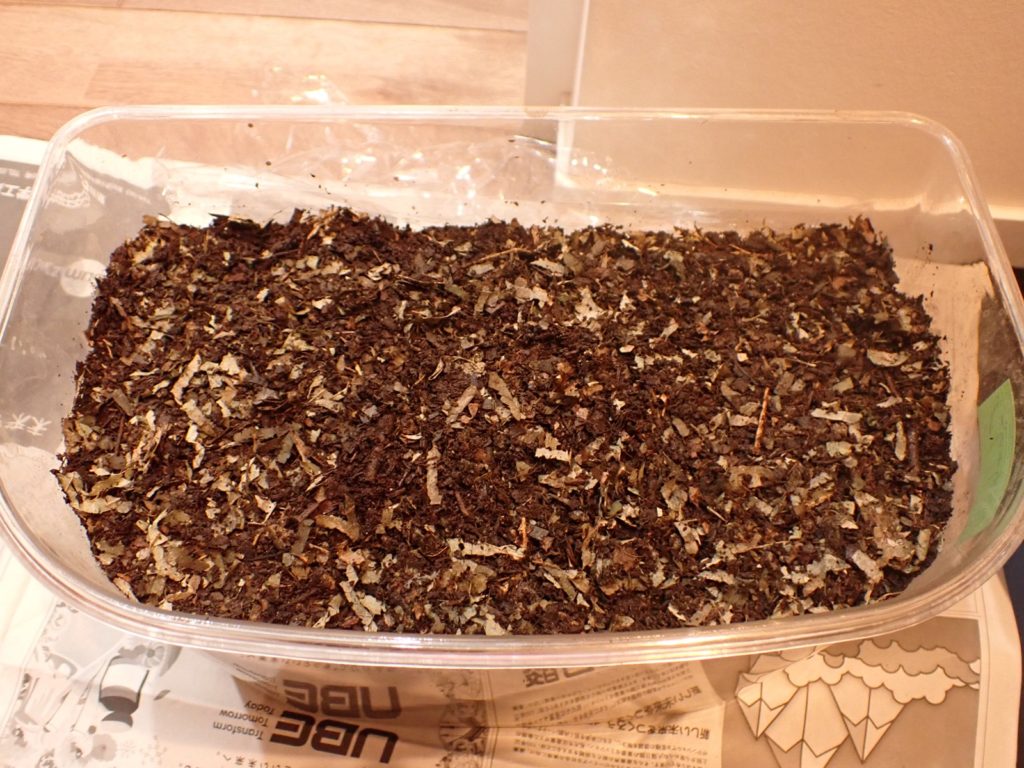 カナブンに続き、新しい腐葉土(葛由来+購入)を導入.保湿を緩めて蓋を閉じ作業完了.