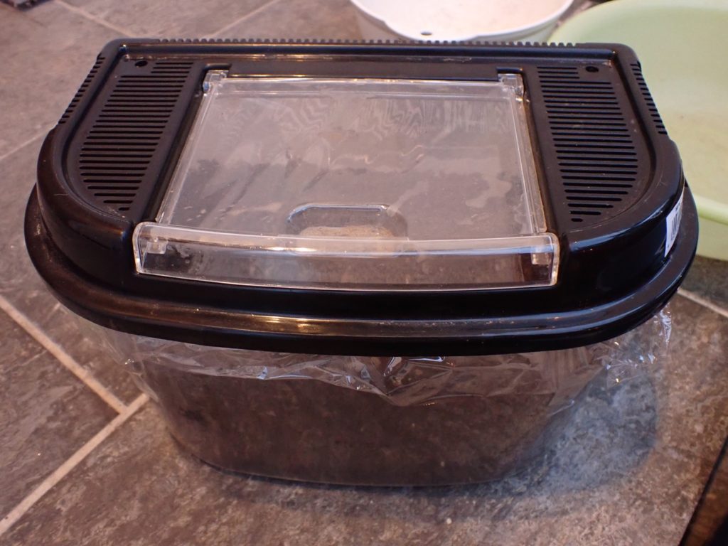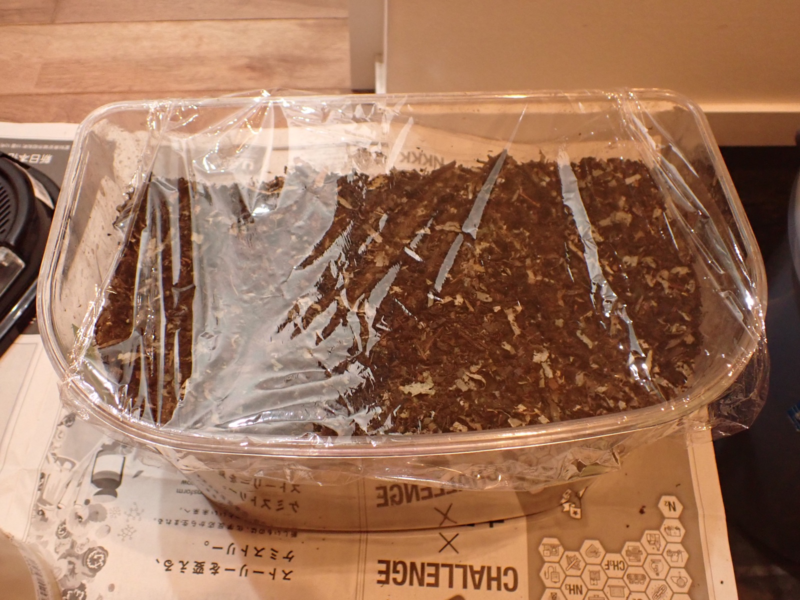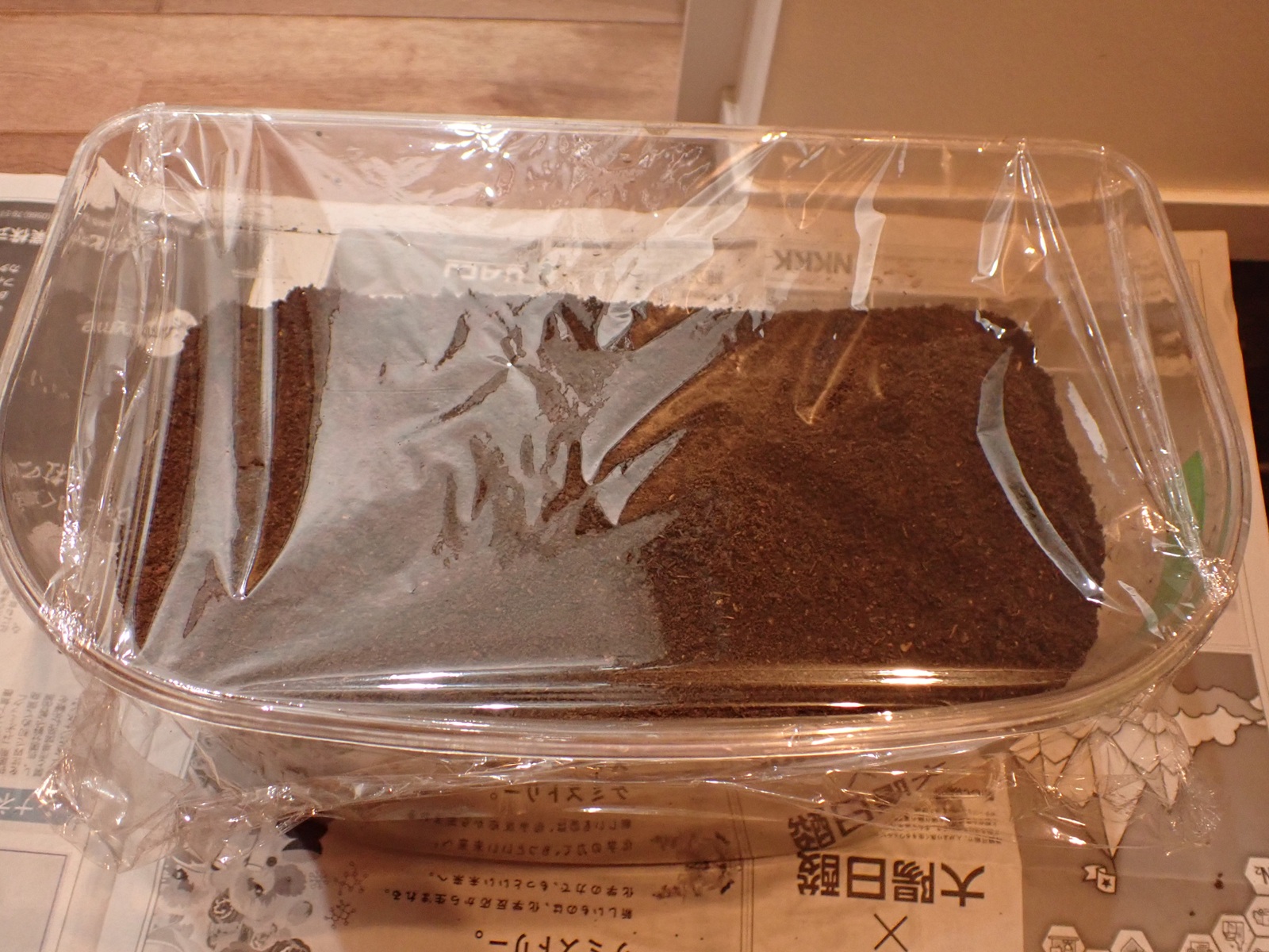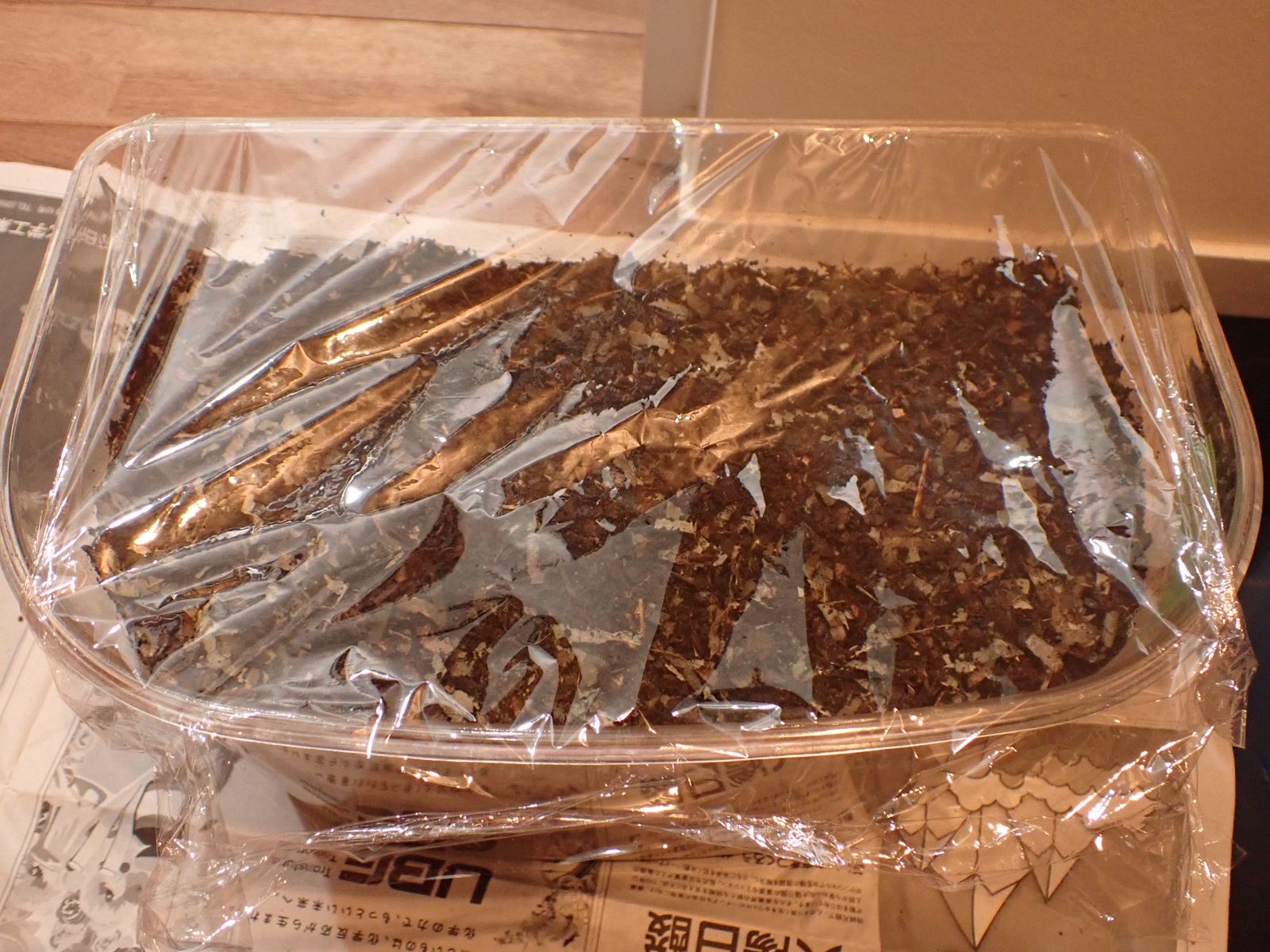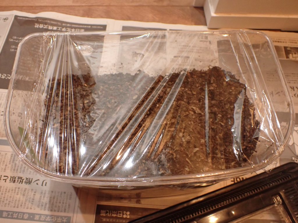 糞を除去し、除去した分、4握り分の新たなマットを足して蓋を閉じた.十分湿っていたので、保湿の為のラップは隙間を多めにとった.