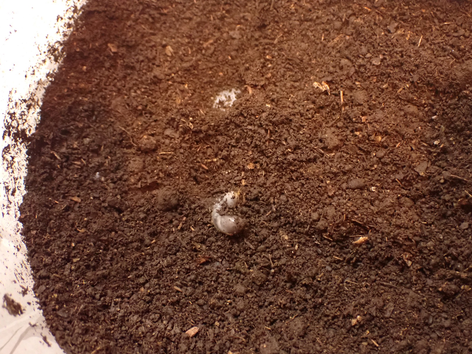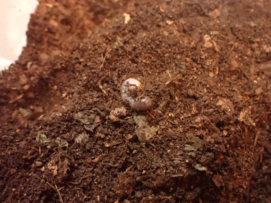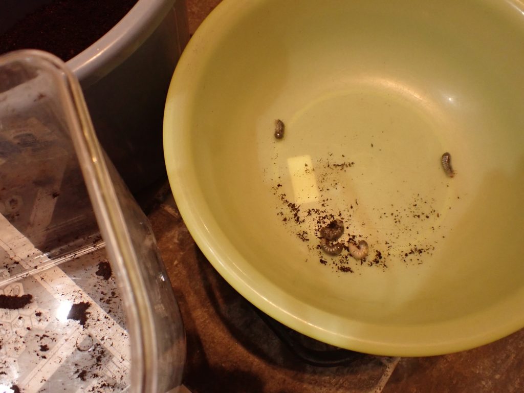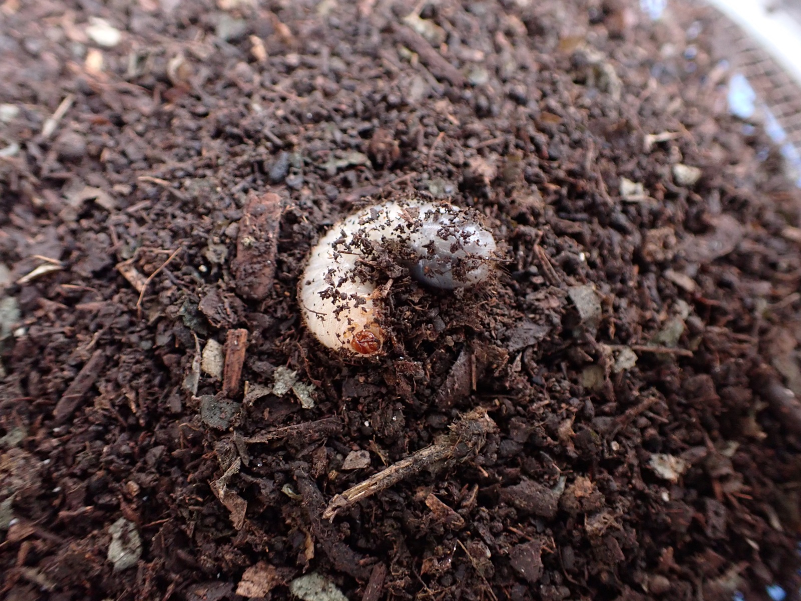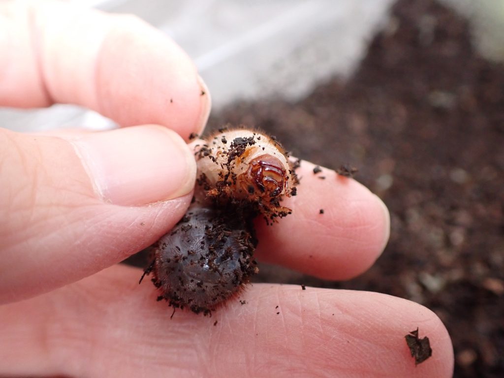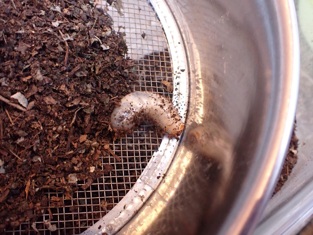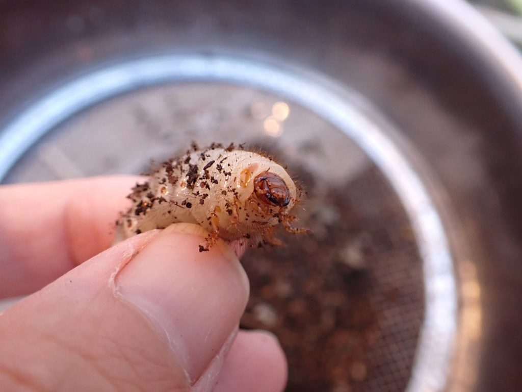 マット表面はカラカラだったが、少し掘ると湿り気が現れ、更に掘ると幼虫が出てきた.
