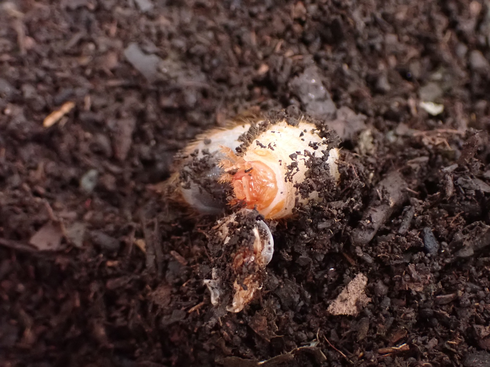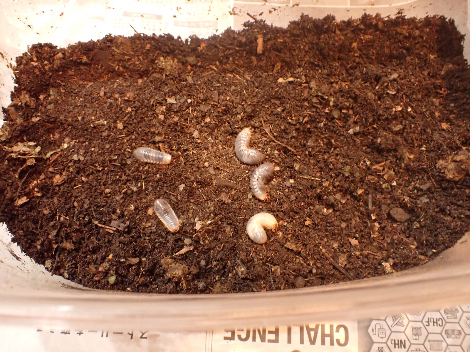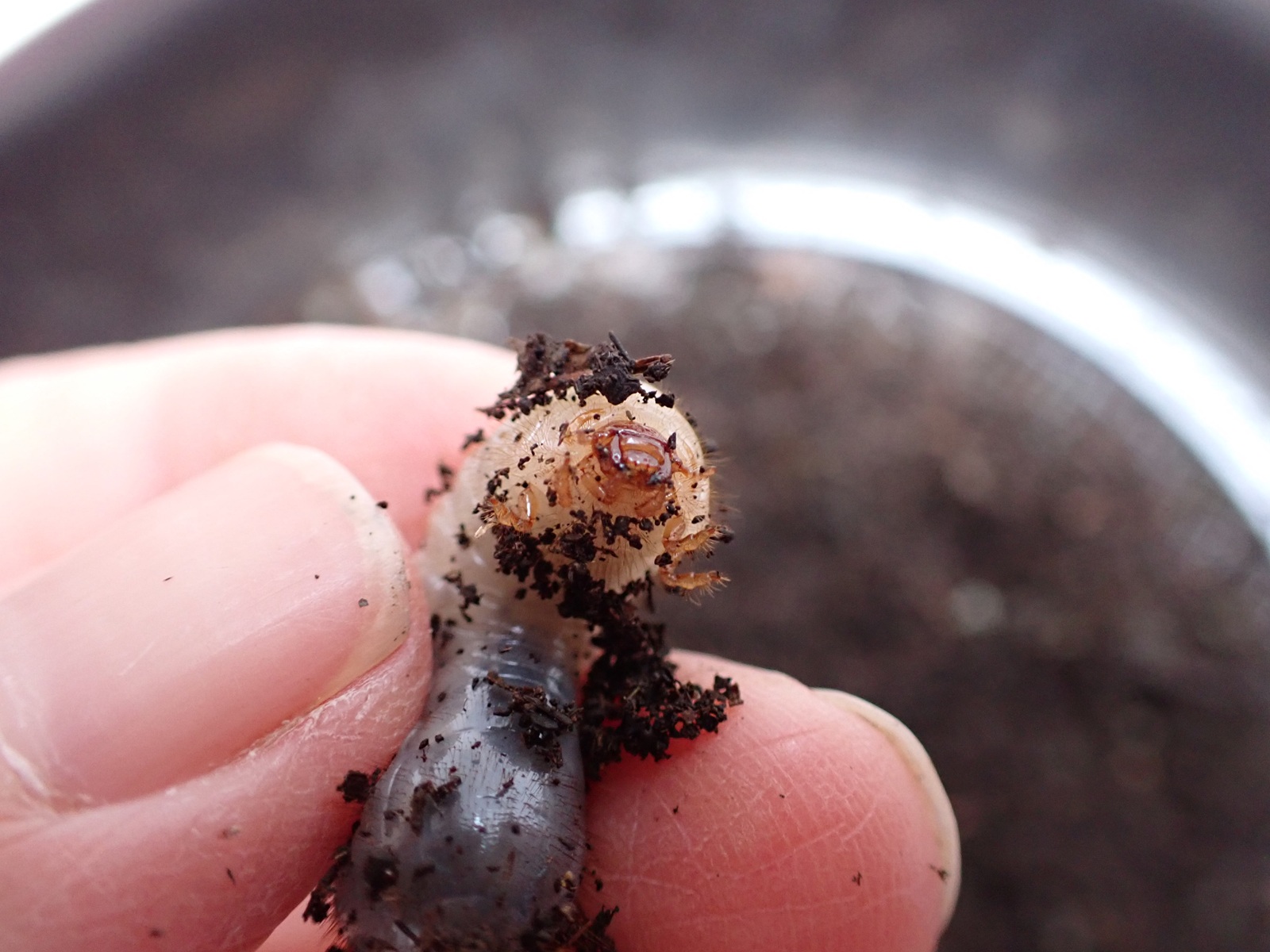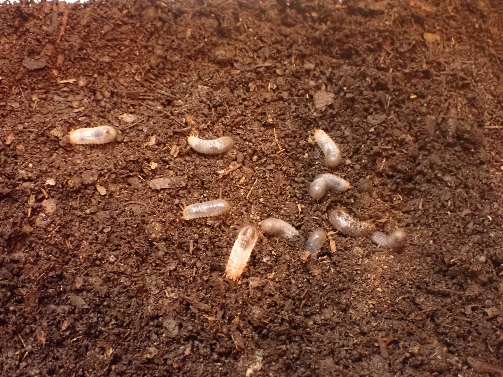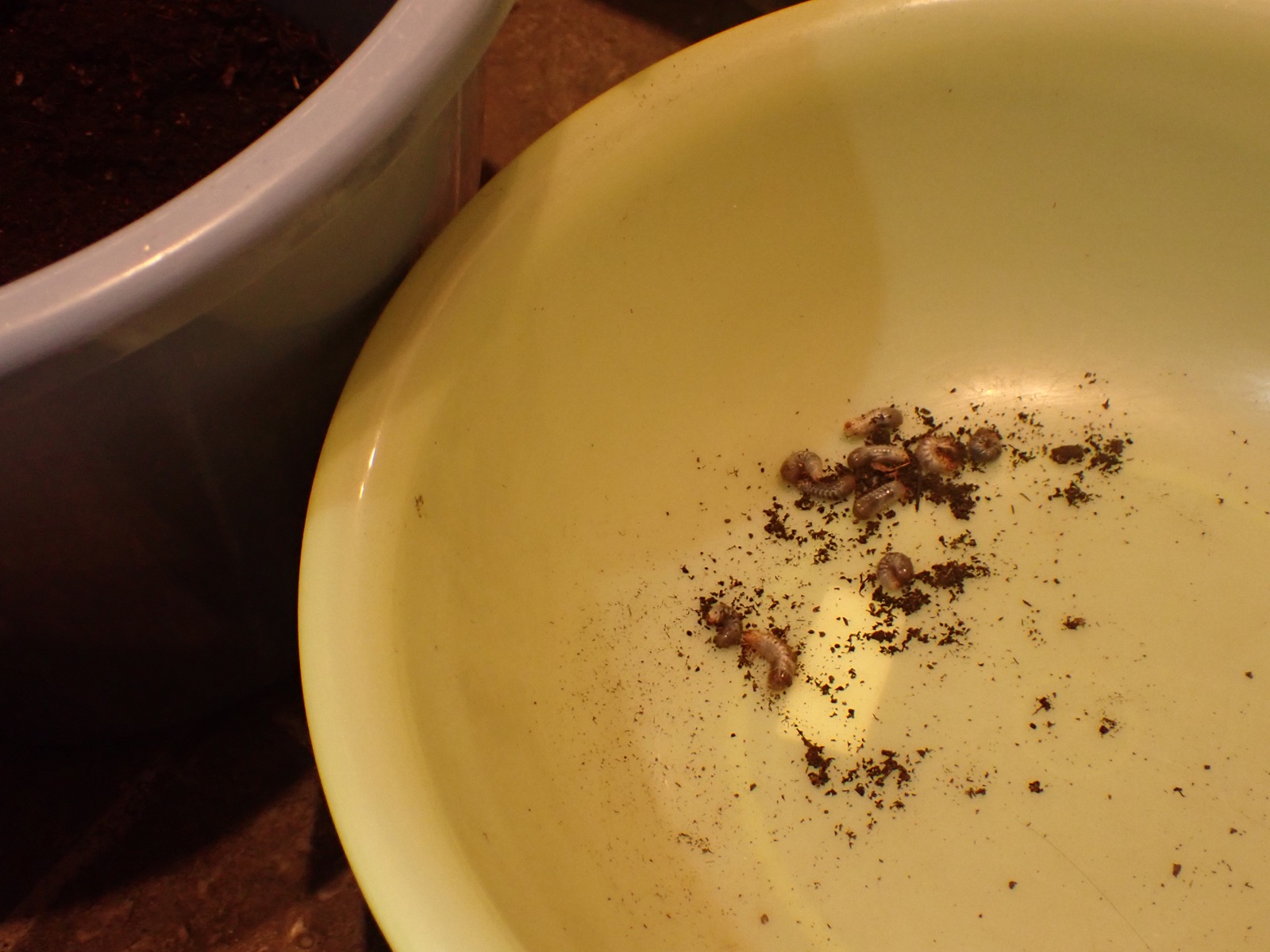 マット表面はカラカラだったが、少し掘ると湿り気が現れ、更に掘ると幼虫が出てきた.