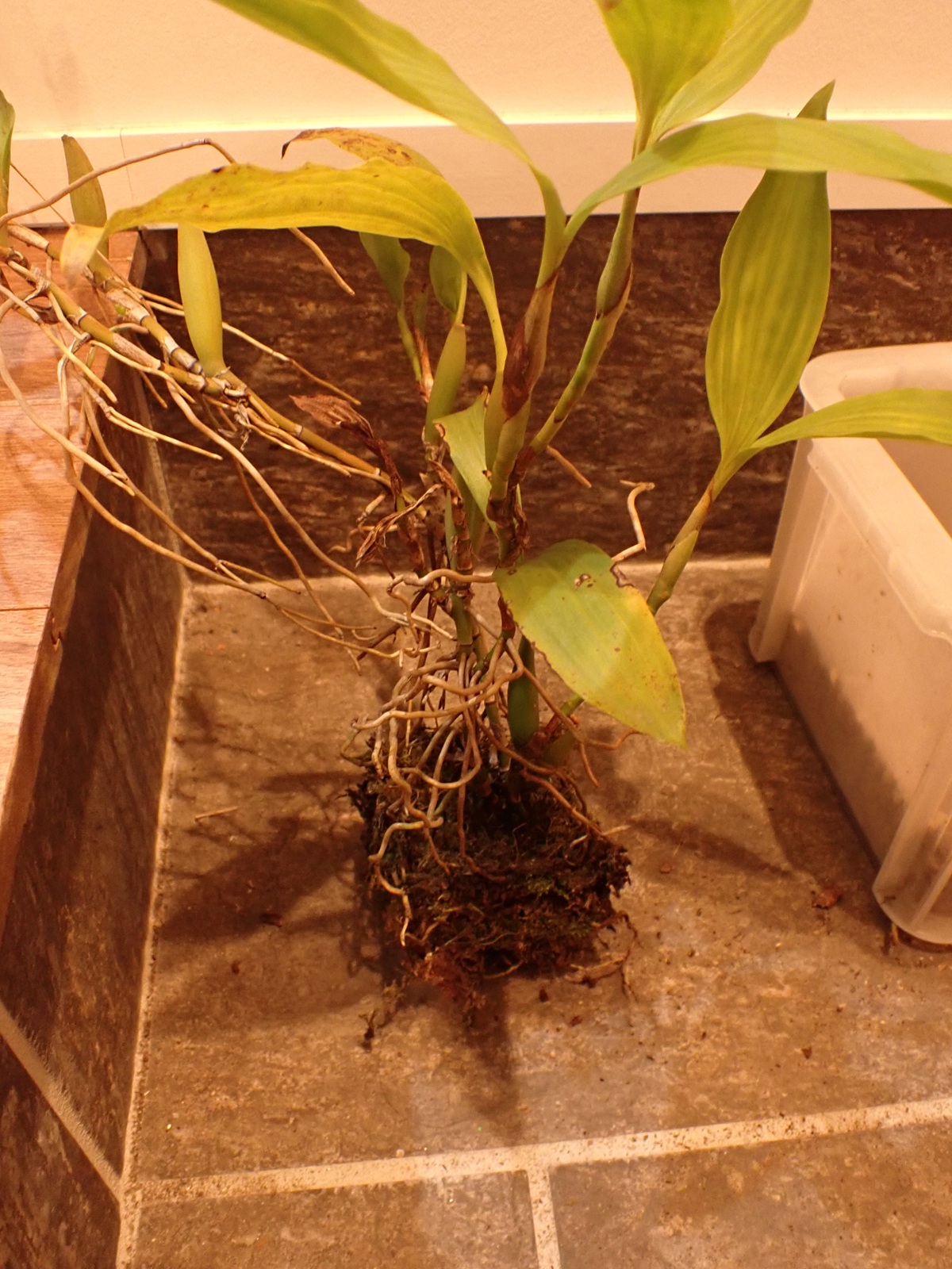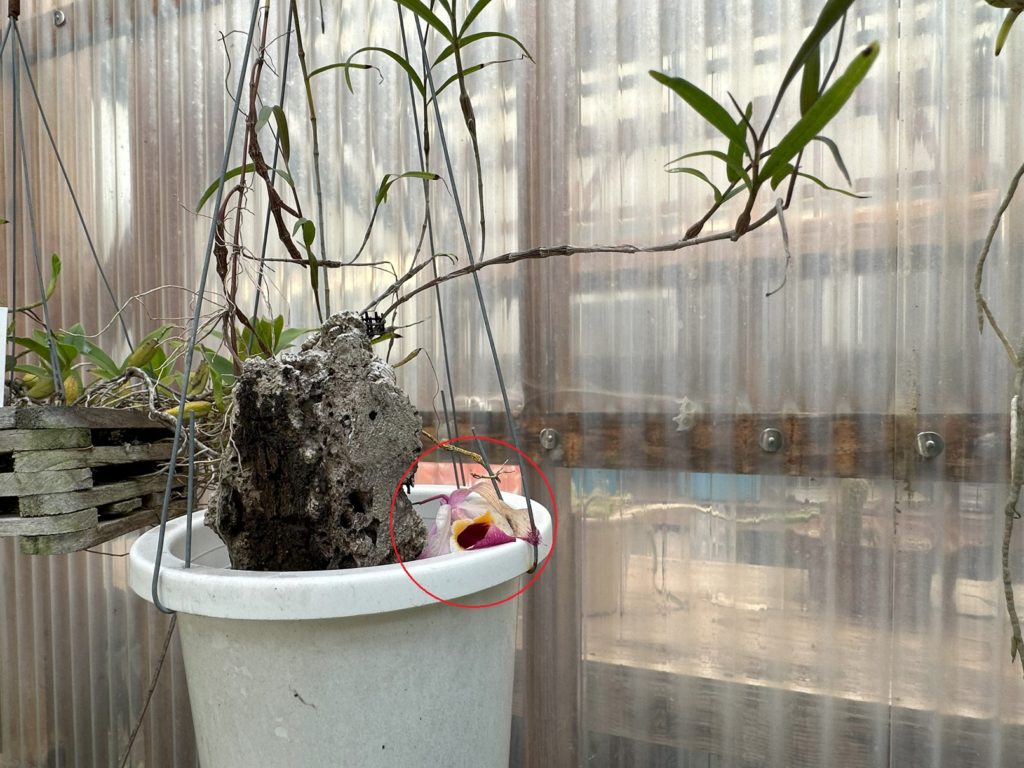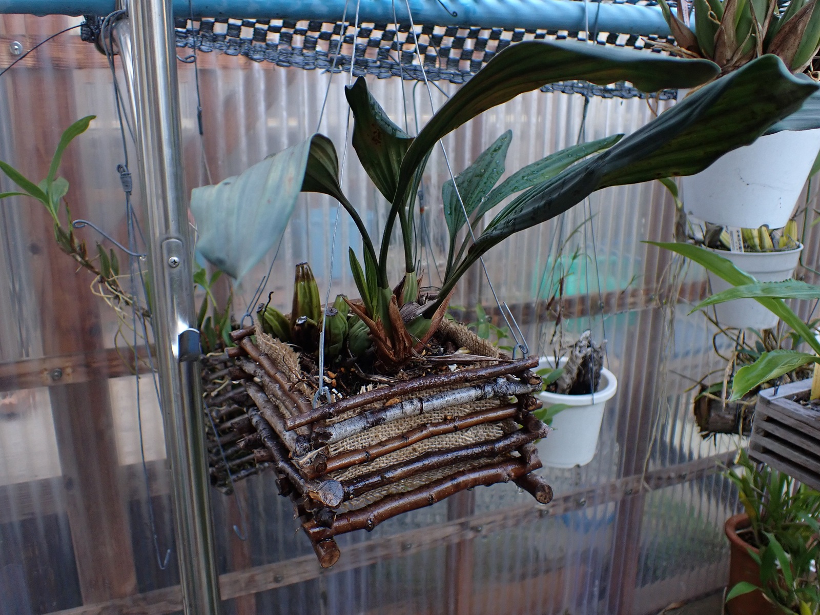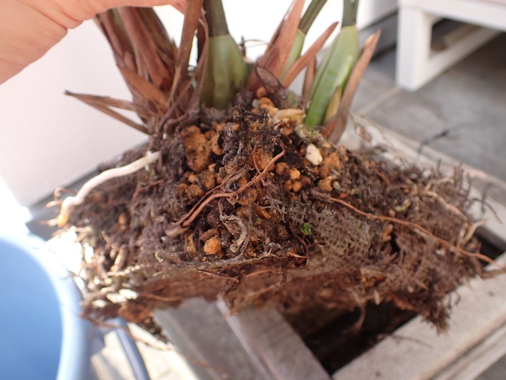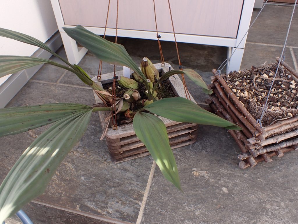 2022年の春に蘭バスケットに植え込んでいたセロジネ ミニアタ(Coelogyne miniata).それから3年が経過し、株は大きく伸び、植え込み材もきっと傷んでいる.