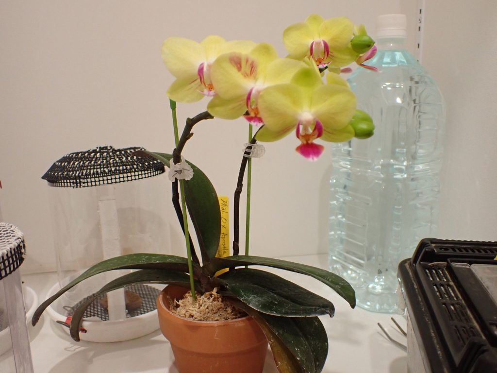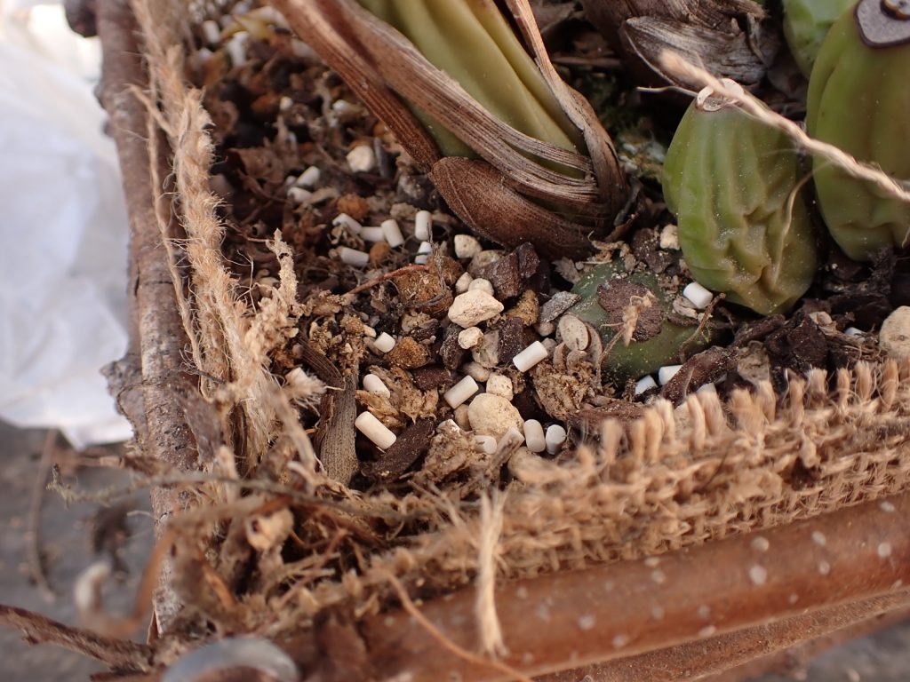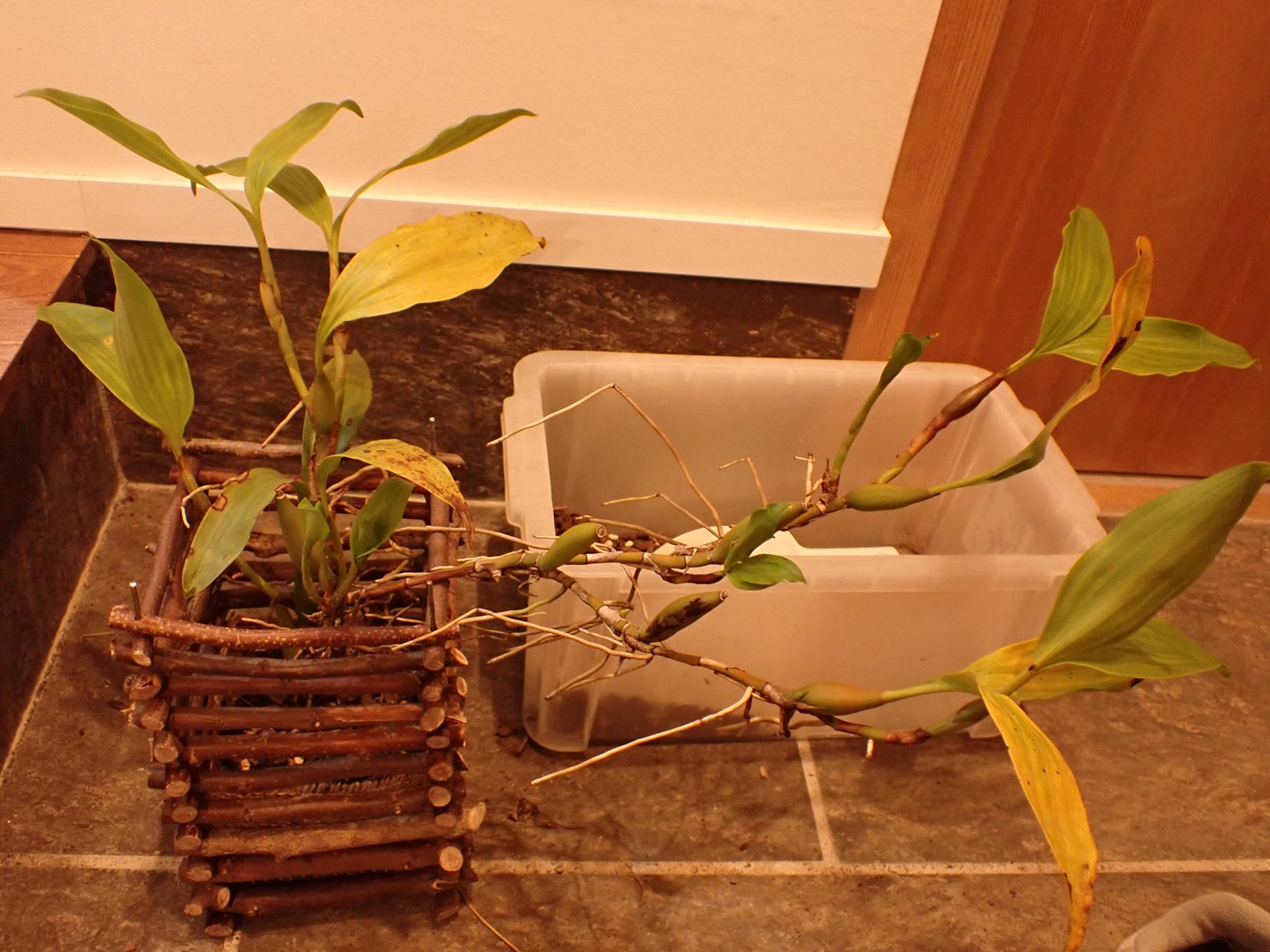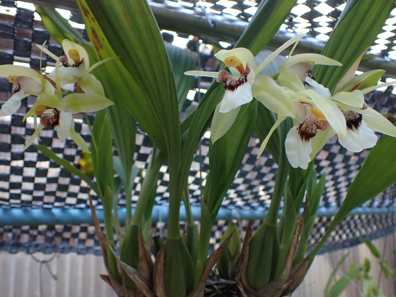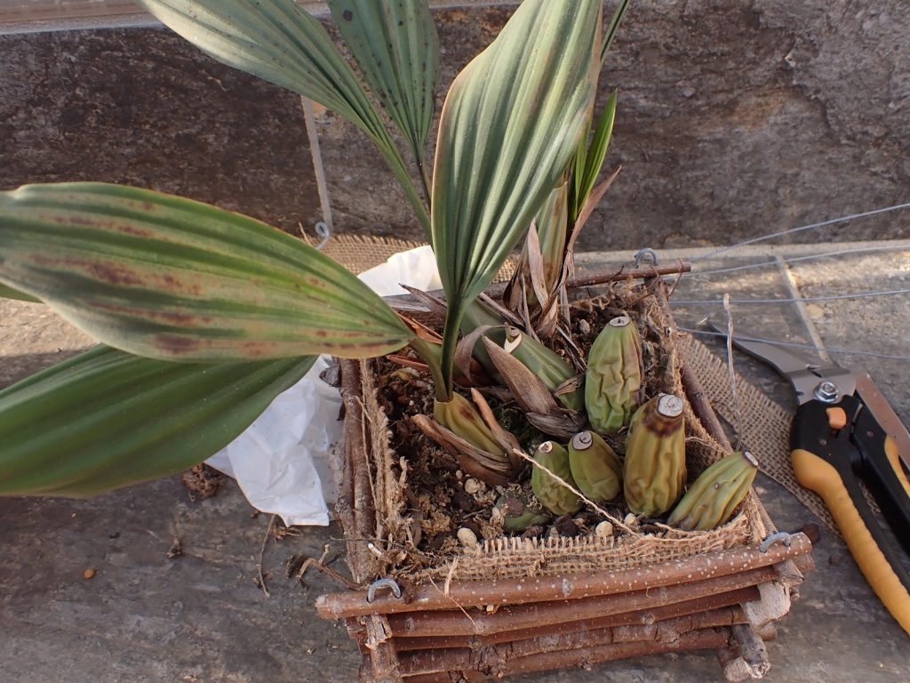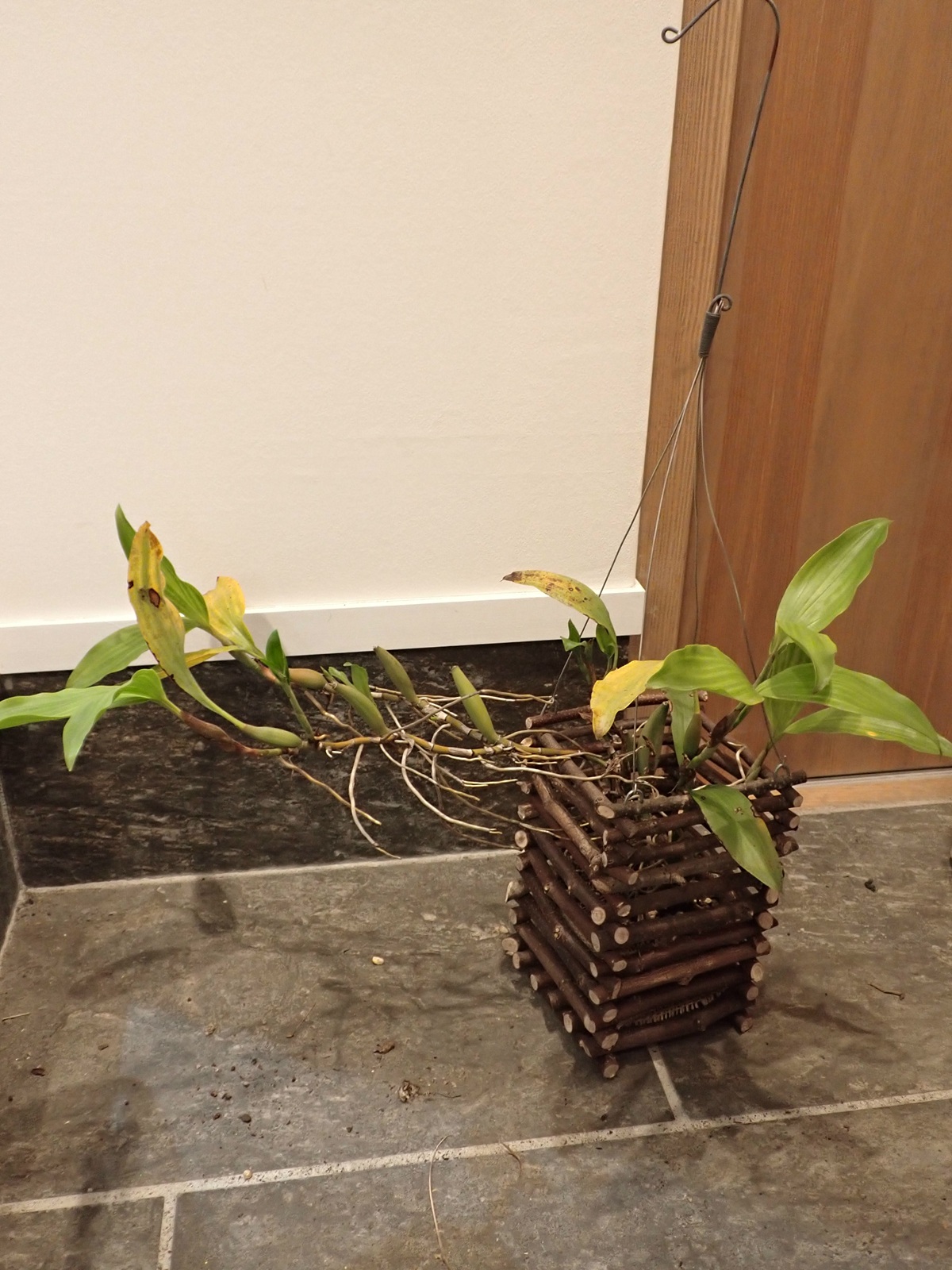 2022年の春に蘭バスケットに植え込んでいたセロジネ ミニアタ(Coelogyne miniata).それから3年が経過し、株は大きく伸び、植え込み材もきっと傷んでいる.